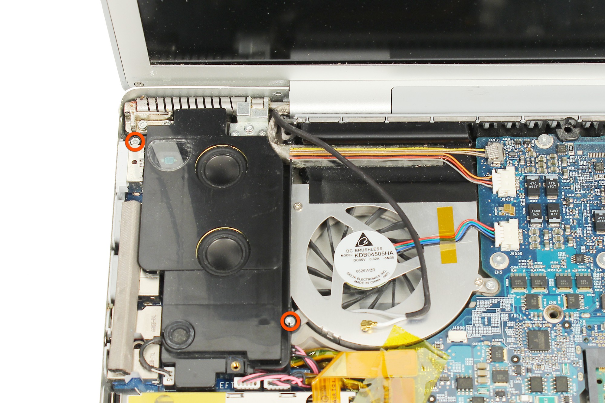 Utilisez un tournevis Torx afin de retirer les deux vis maintenant en place le haut parleur gauche.