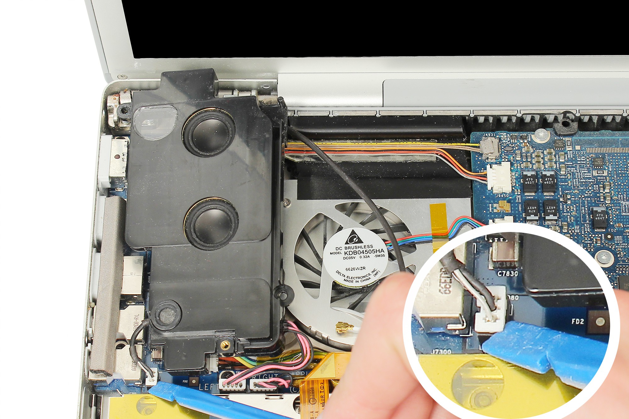 A l'aide d'une spatule en nylon, procédez à la déconnexion du câble d'alimentation du ventilateur droit.