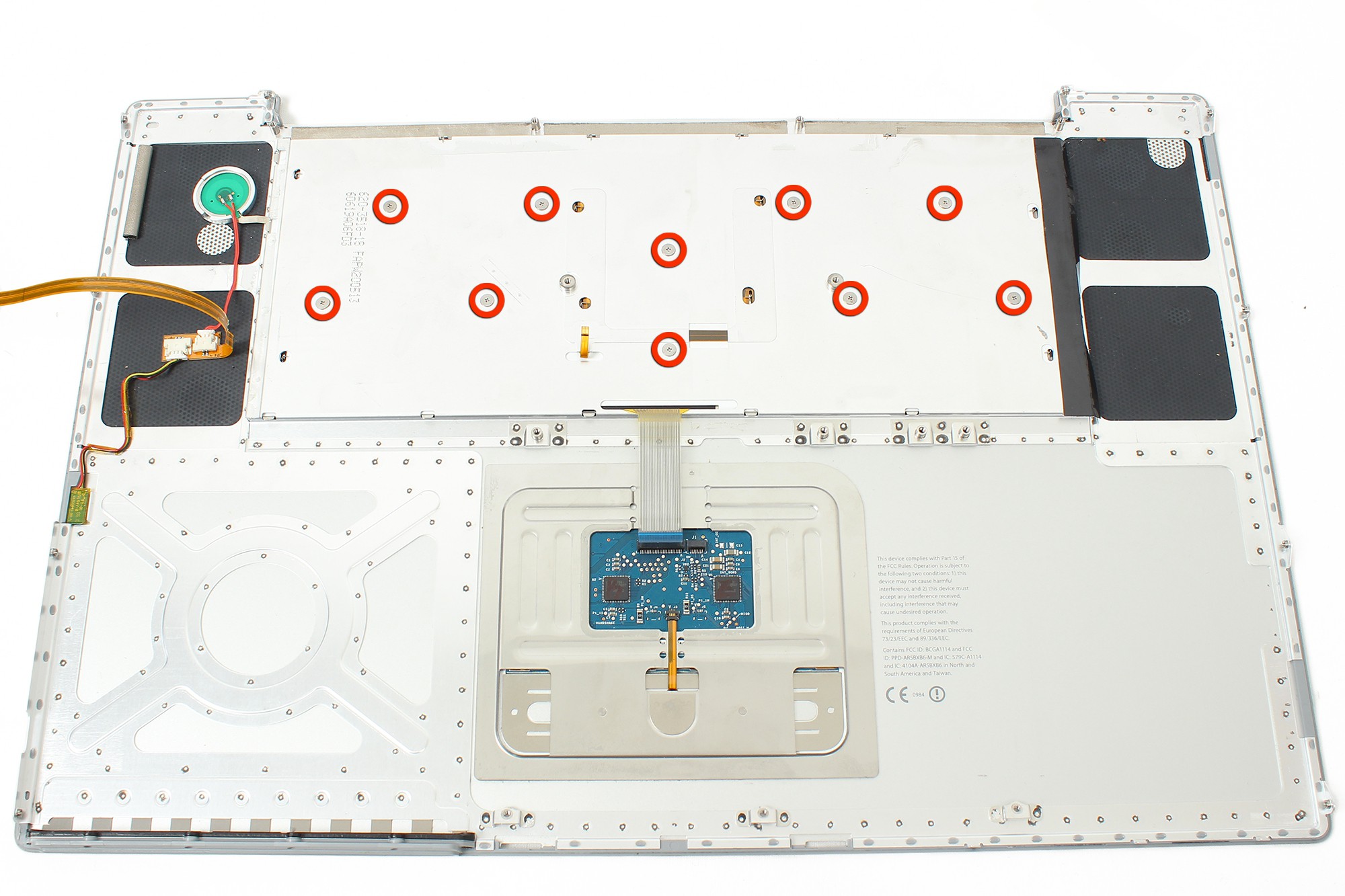 Un câble relie le châssis supérieur à la carte mère du MacBook ! Ne retirez pas encore le châssis supérieur avant d'avoir complété l'étape suivante.
