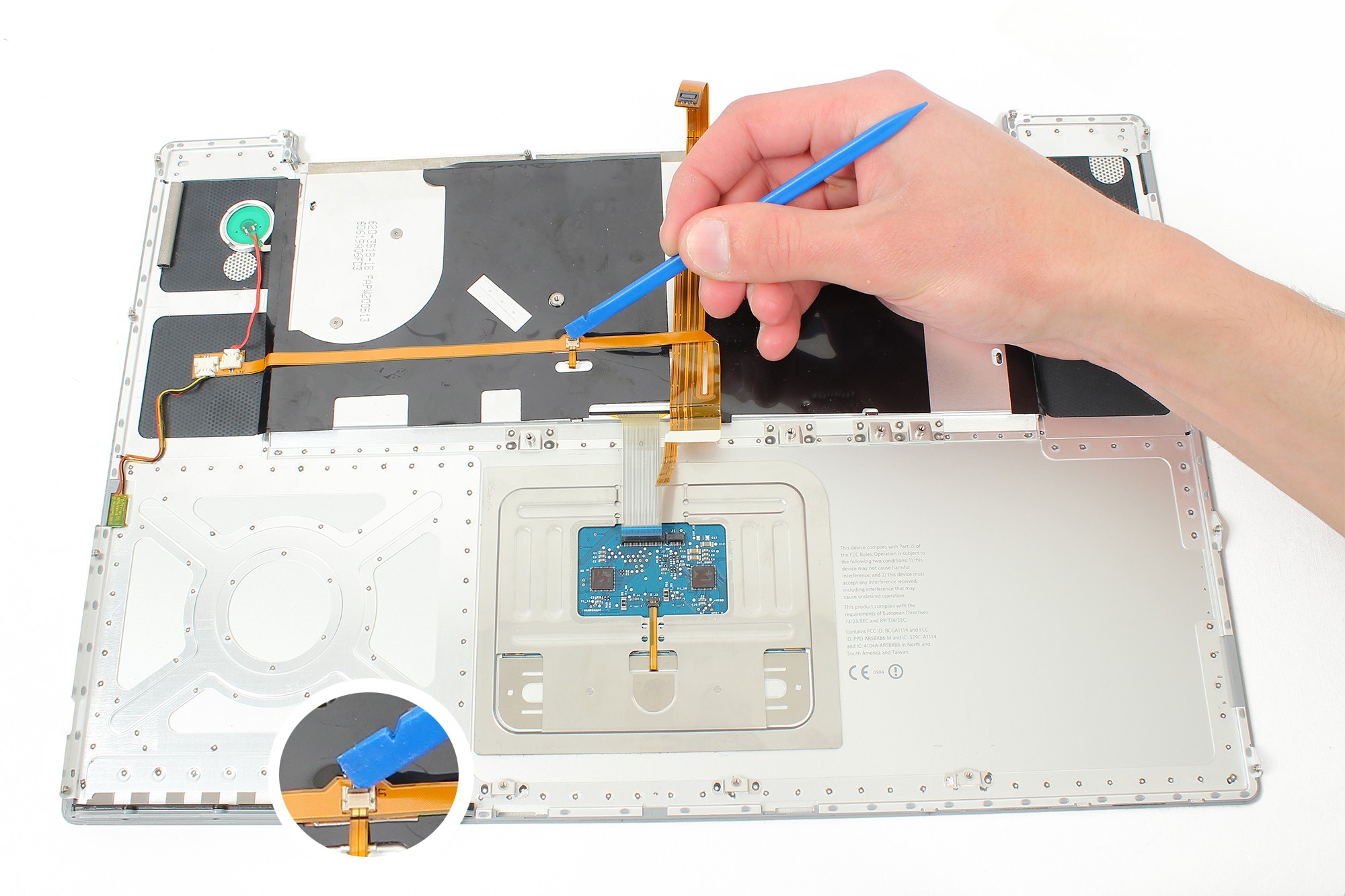 Toujours avec cette spatule en nylon, déverouillez le connecteur FPC de la nappe du trackpad.