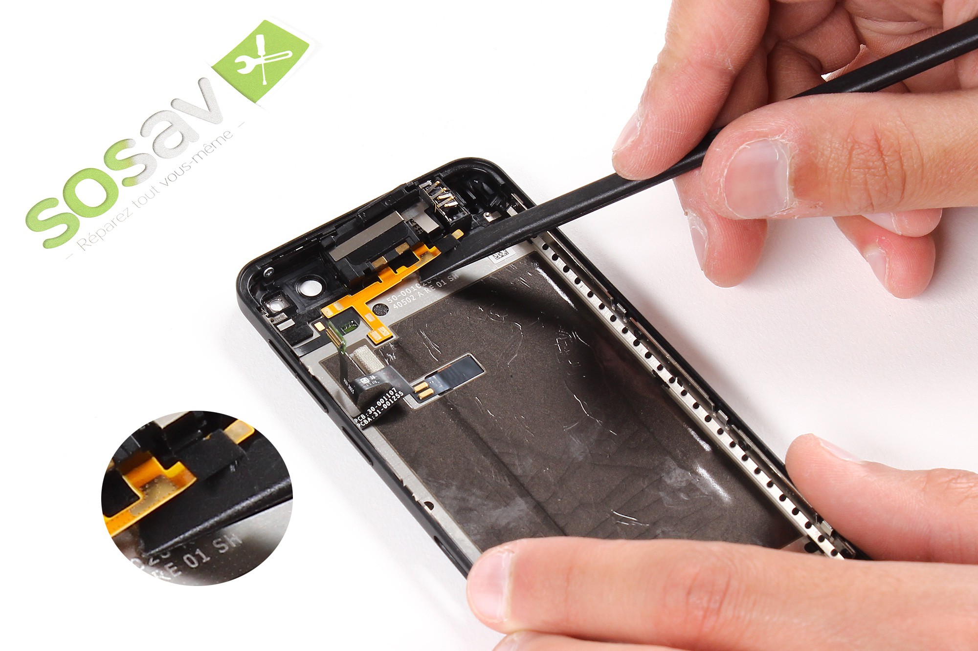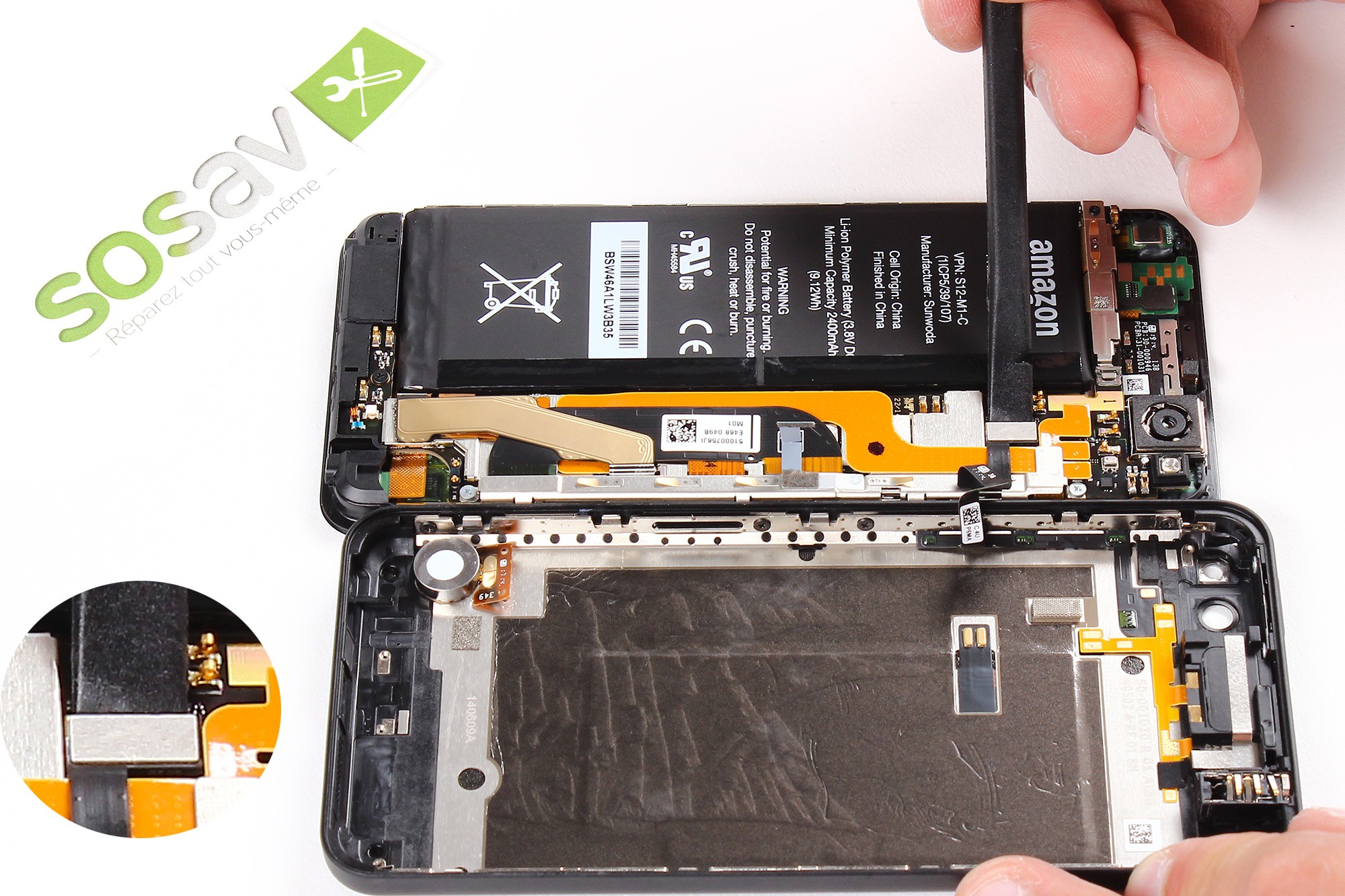 Une nappe relie le téléphone à la coque arrière (CF photo numéro 3) ! Veillez à ne pas l'abîmer !