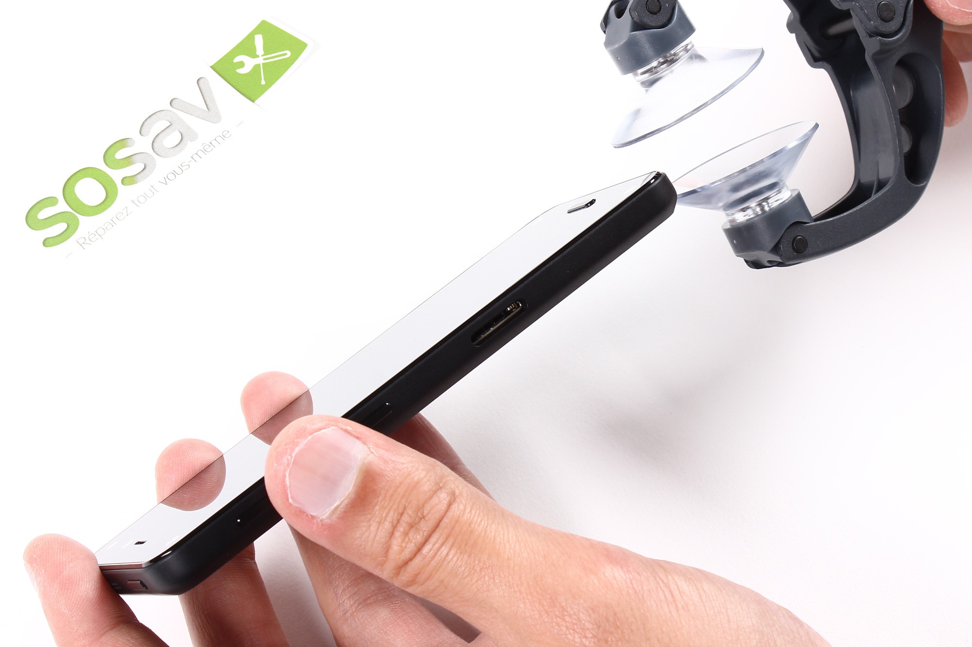 Appuyez ensuite fermement sur les deux ventouses, puis pressez le manche pour exercer le mouvement d'ouverture afin de déclipser le téléphone de sa coque arrière.