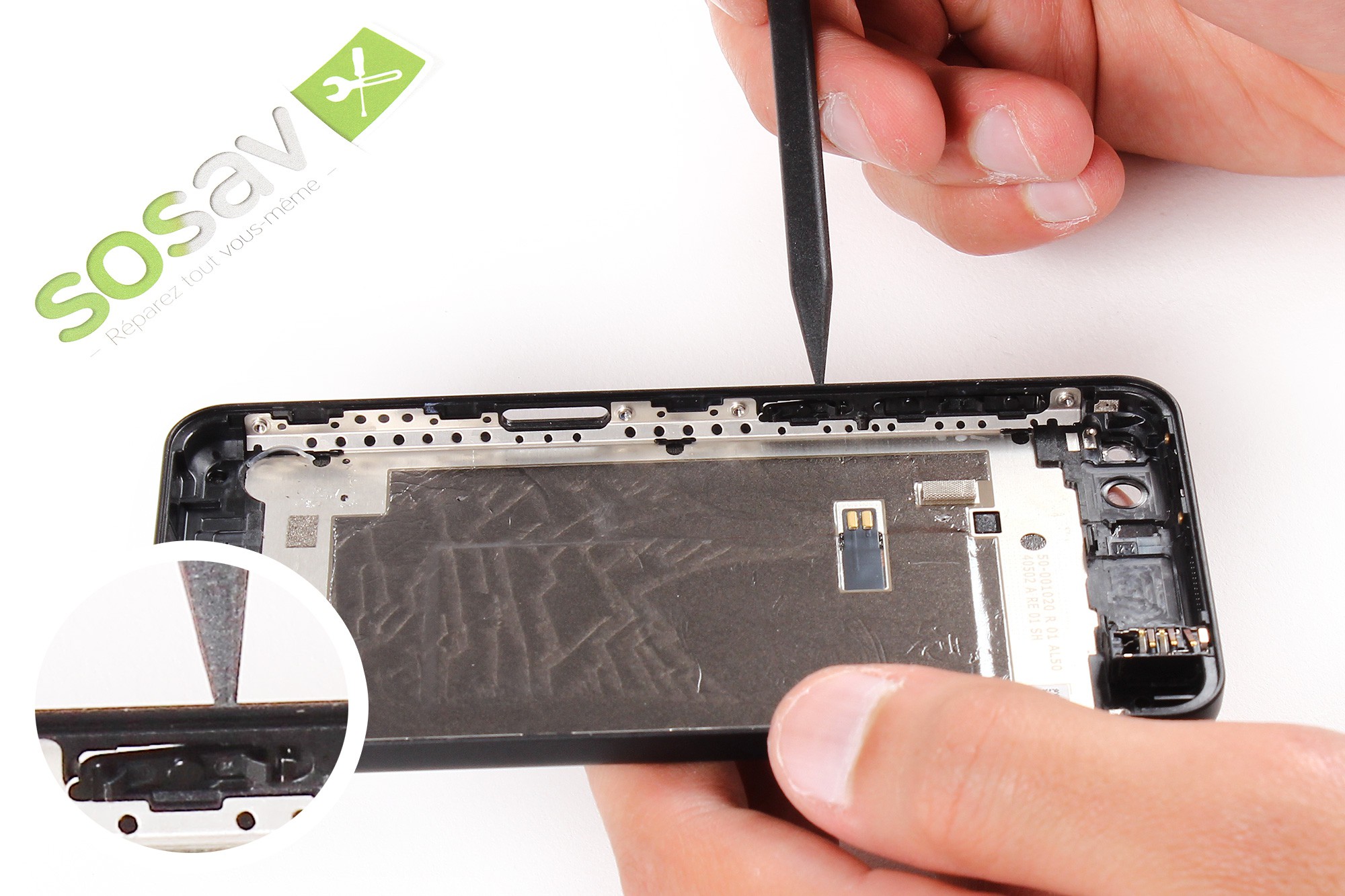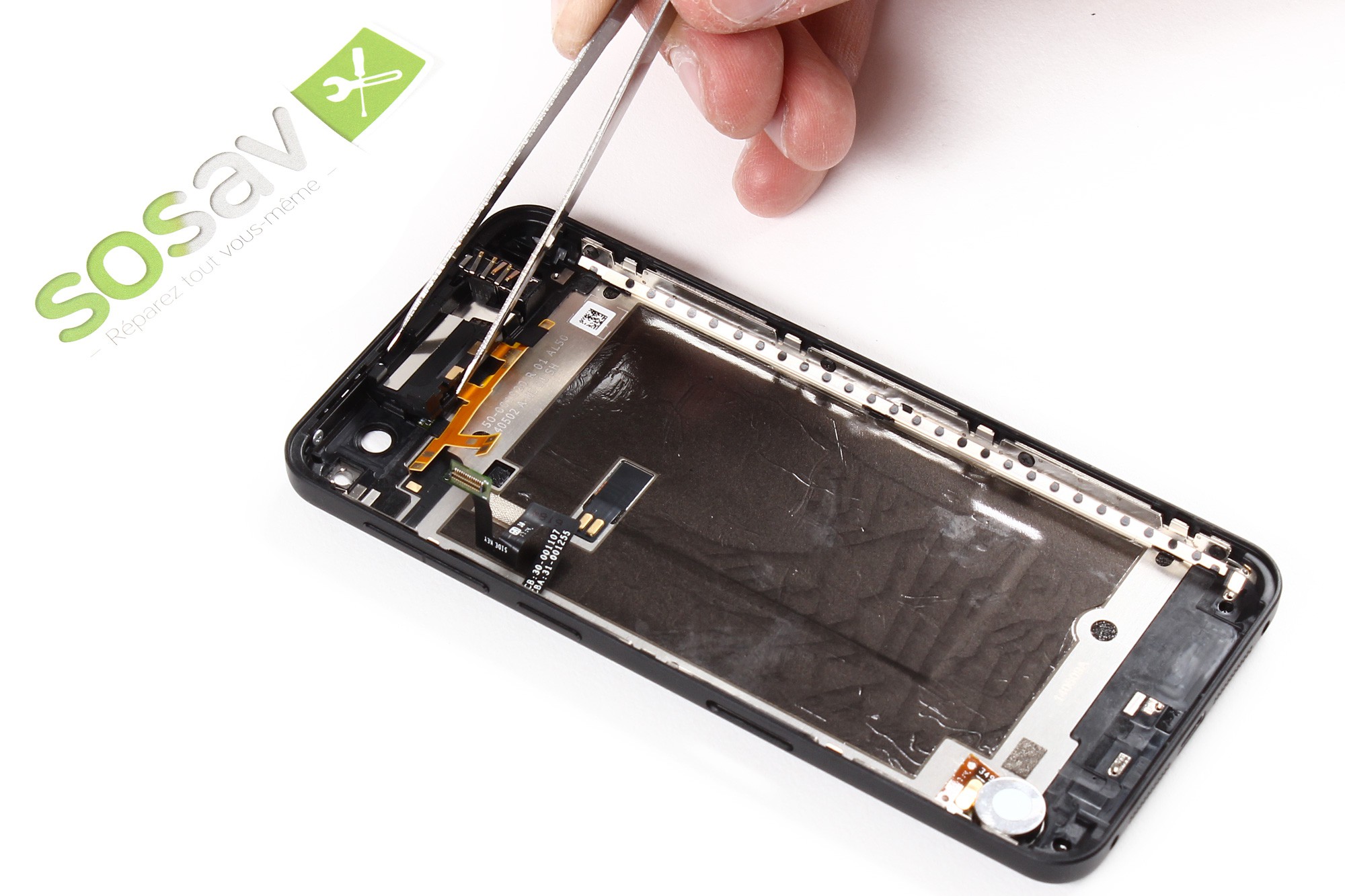 Reprenez la spatule en nylon pour retirer le support ainsi que sa nappe gérant les boutons volume et appareil photo.