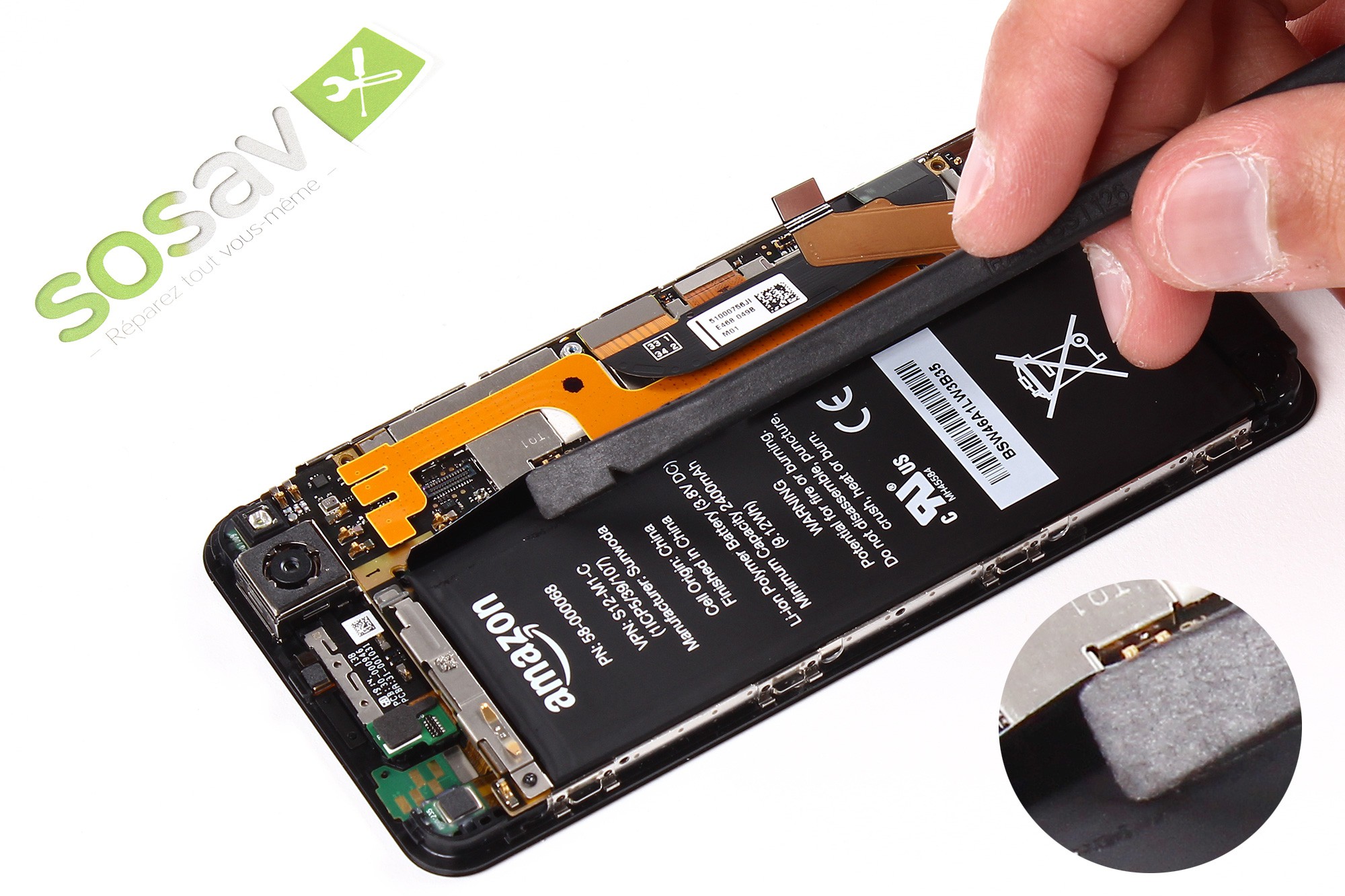 Nous poursuivons notre démontage en déconnectant juste après la nappe de la batterie à l'aide de notre très chère spatule en nylon passe-partout.