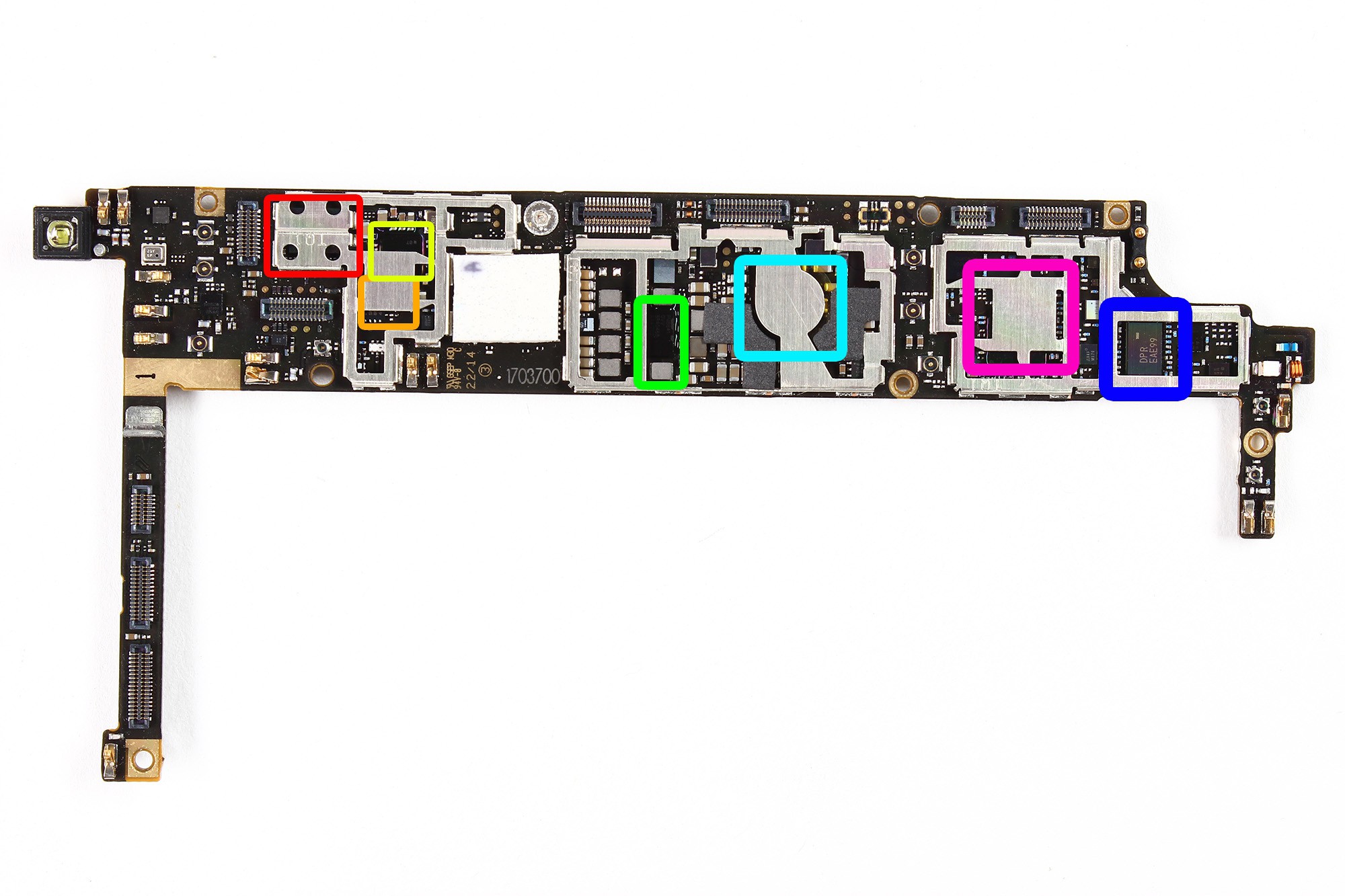 En Jaune : Composant radio Qualcomm WCN3680 (WiFi + Bluetooth + FM)