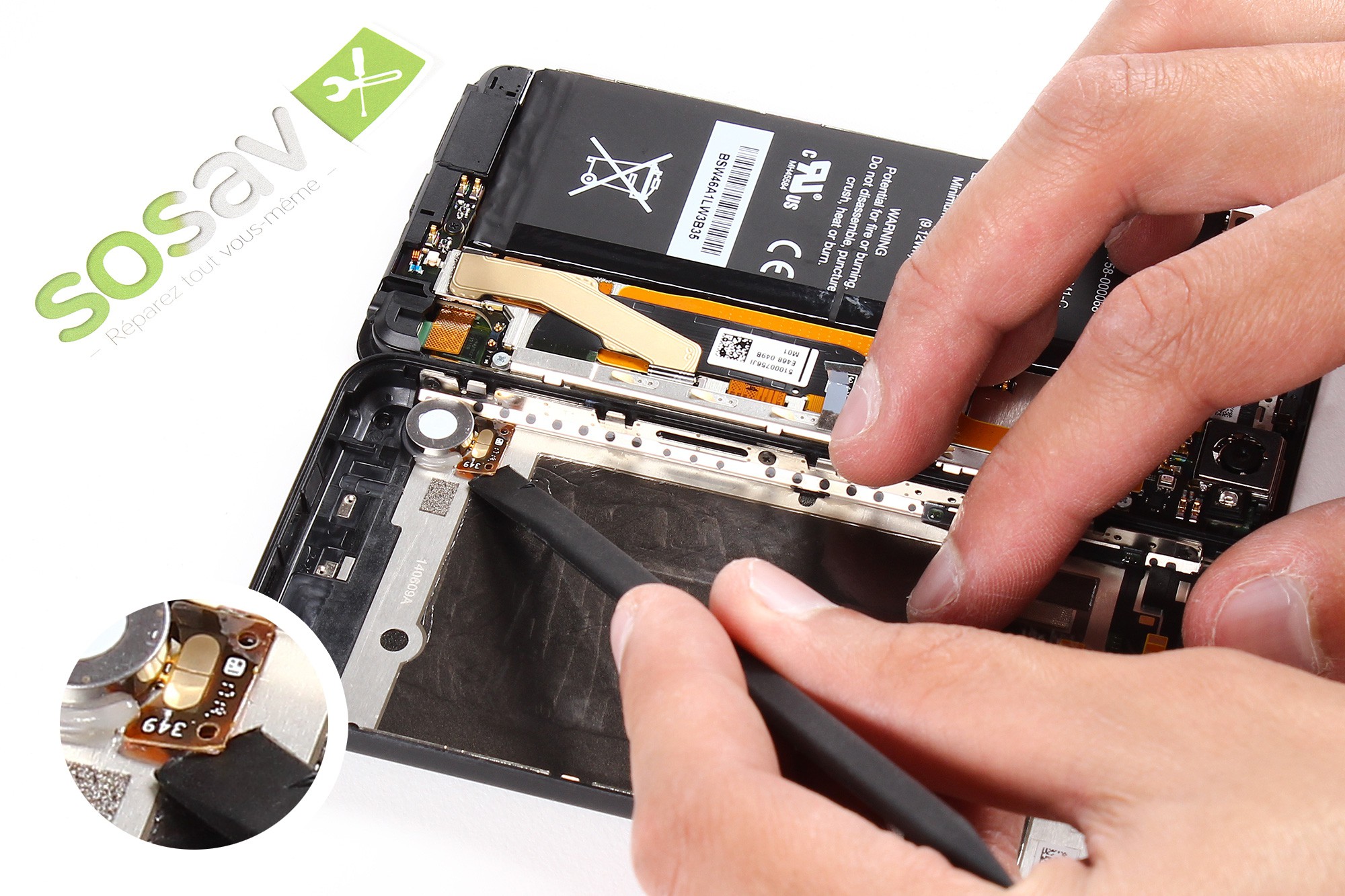 A l'aide d'une spatule en nylon, commencez par décoller délicatement la partie contact du vibreur, comme indiqué sur les deux photos.