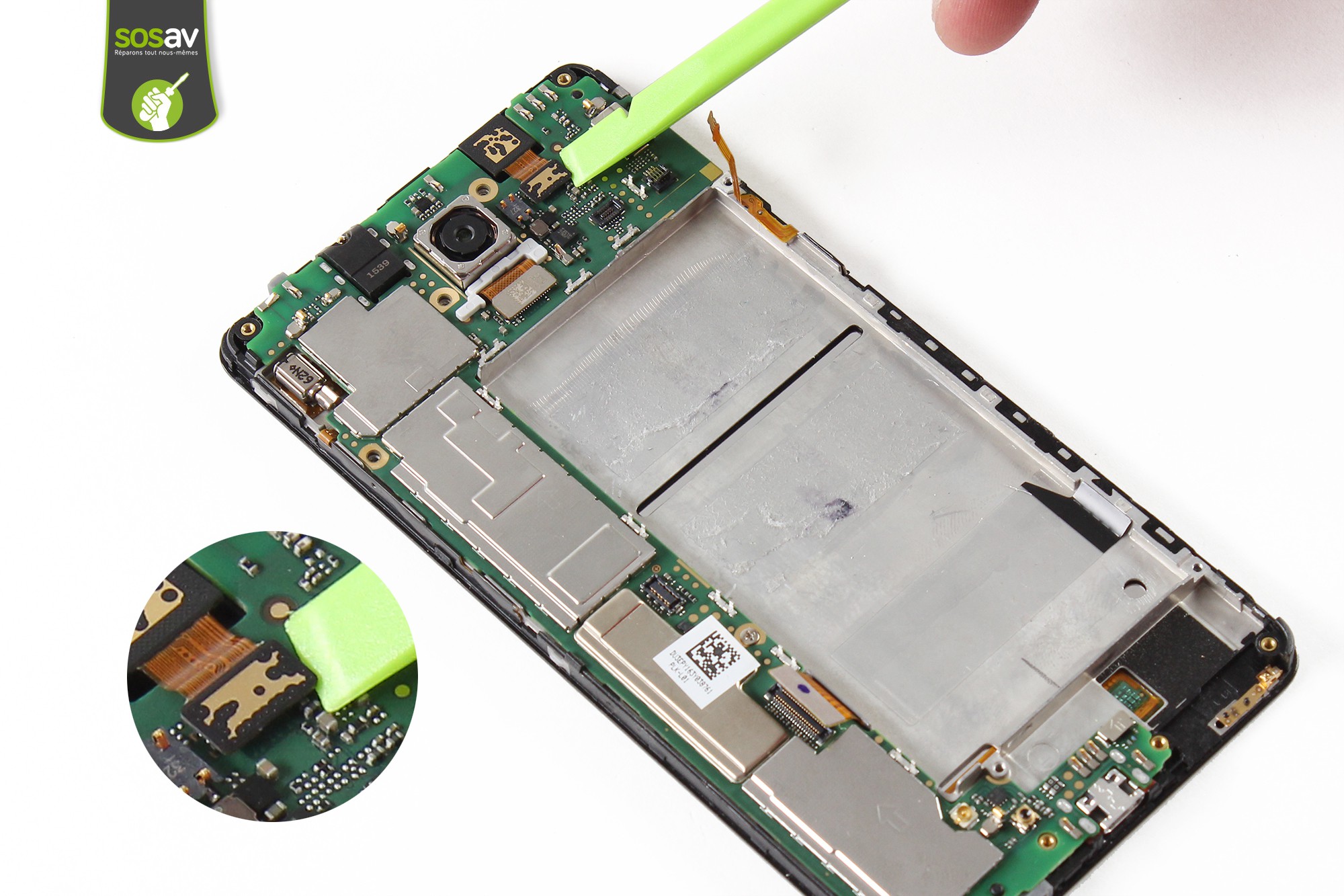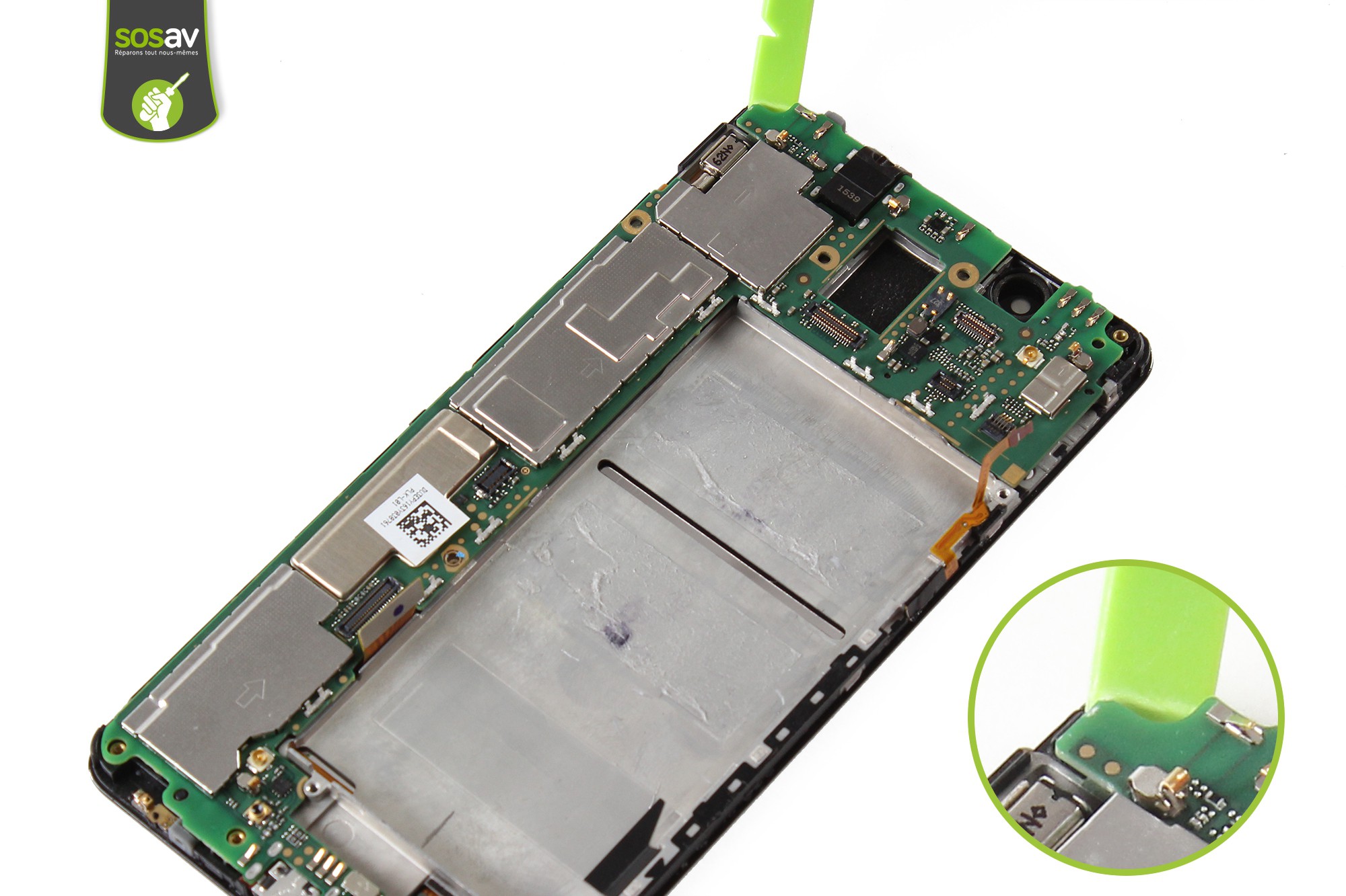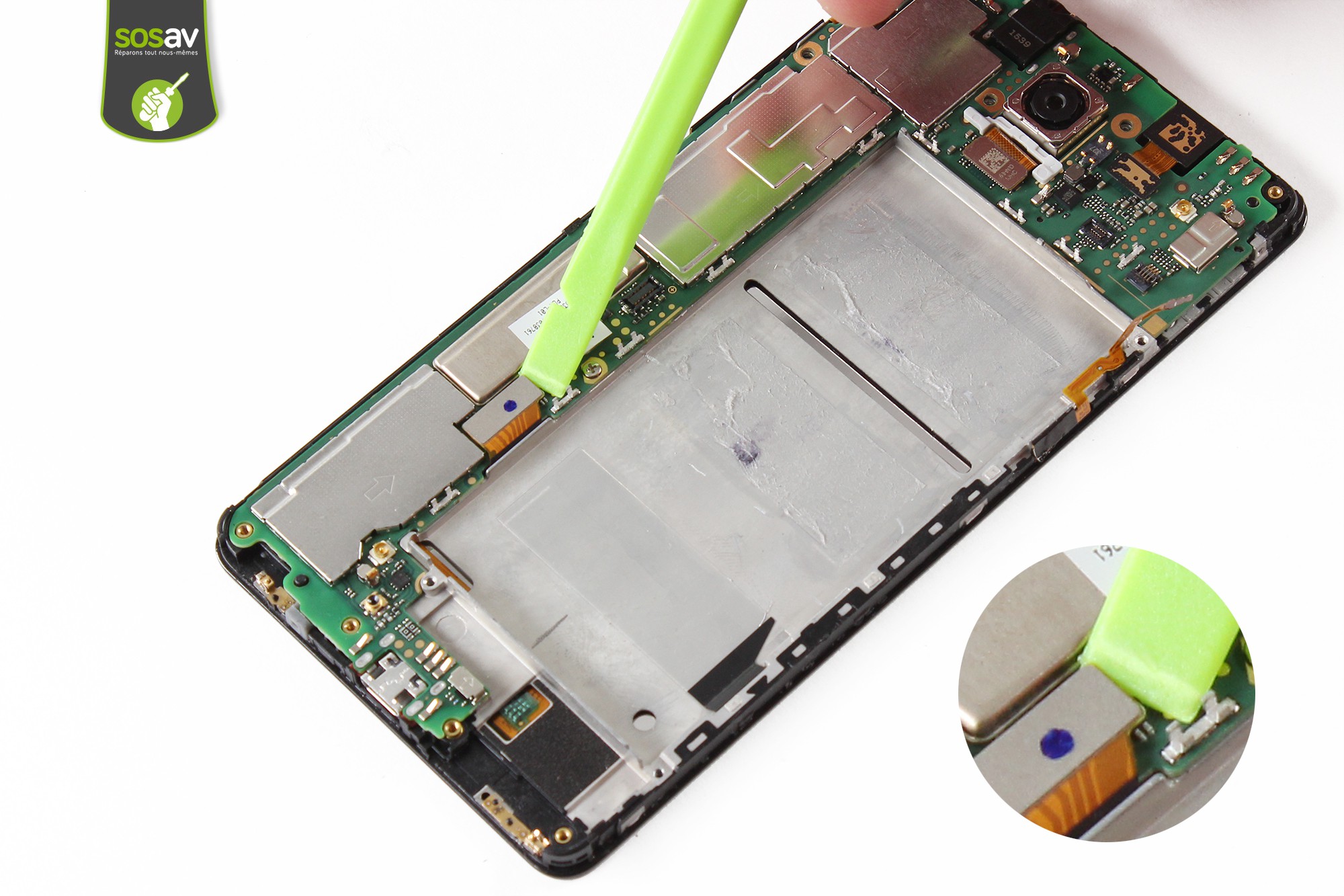 Avant de poursuivre le guide, il est nécessaire pour des raisons de sécurité de déconnecter la batterie du téléphone.Déconnectez la batterie grâce à la spatule en nylon.