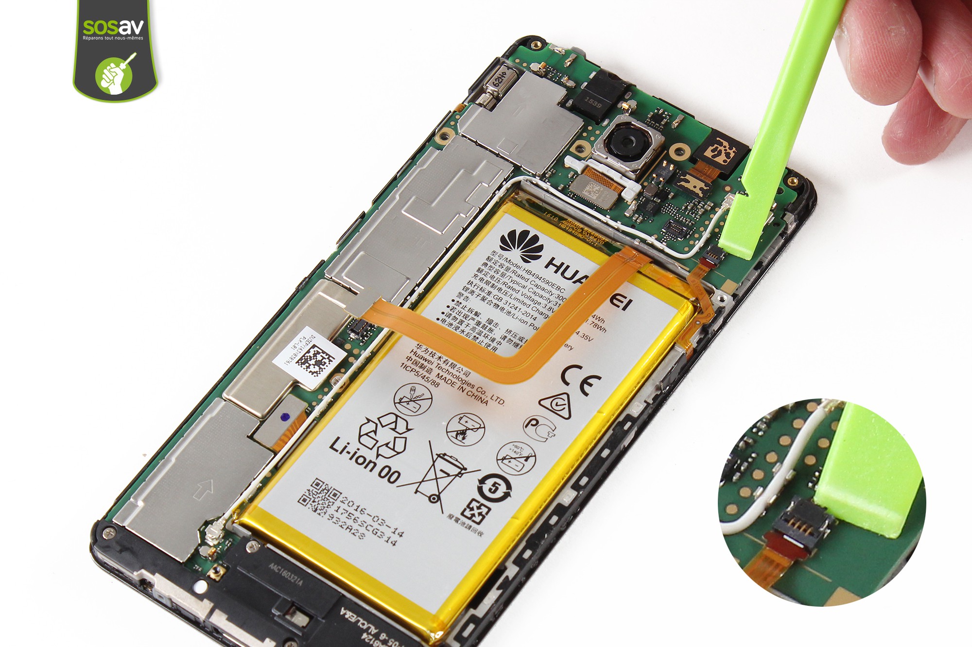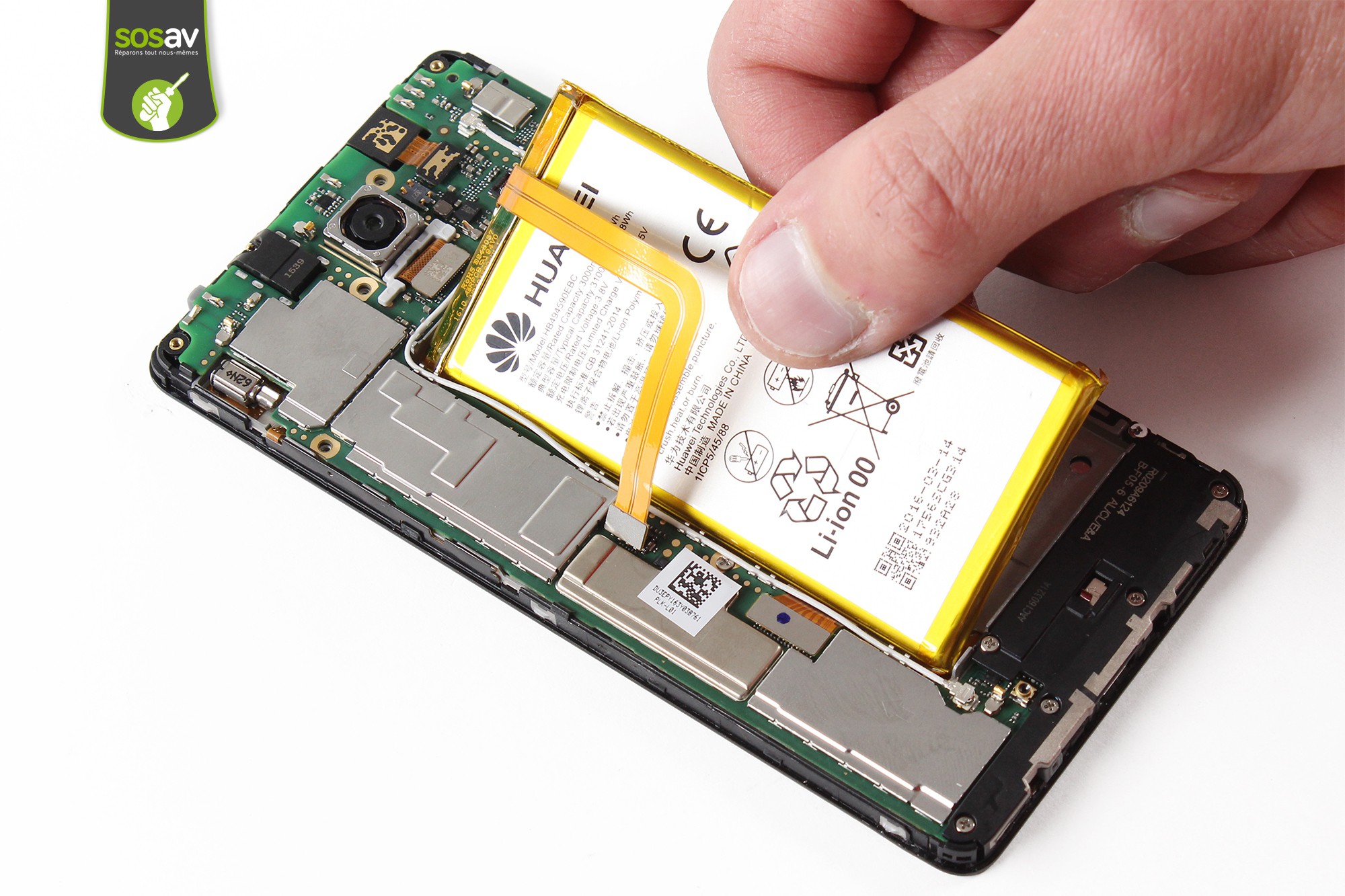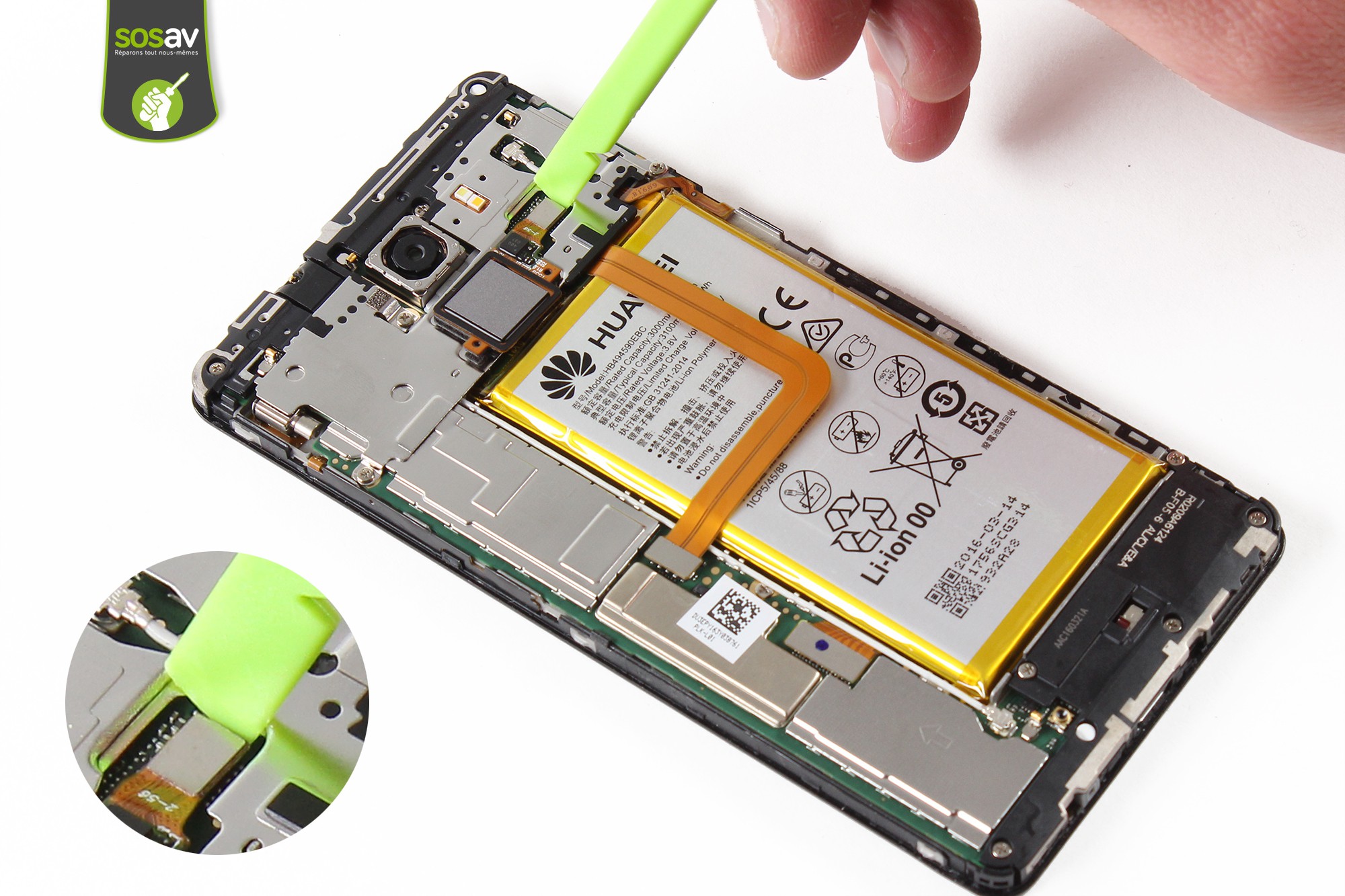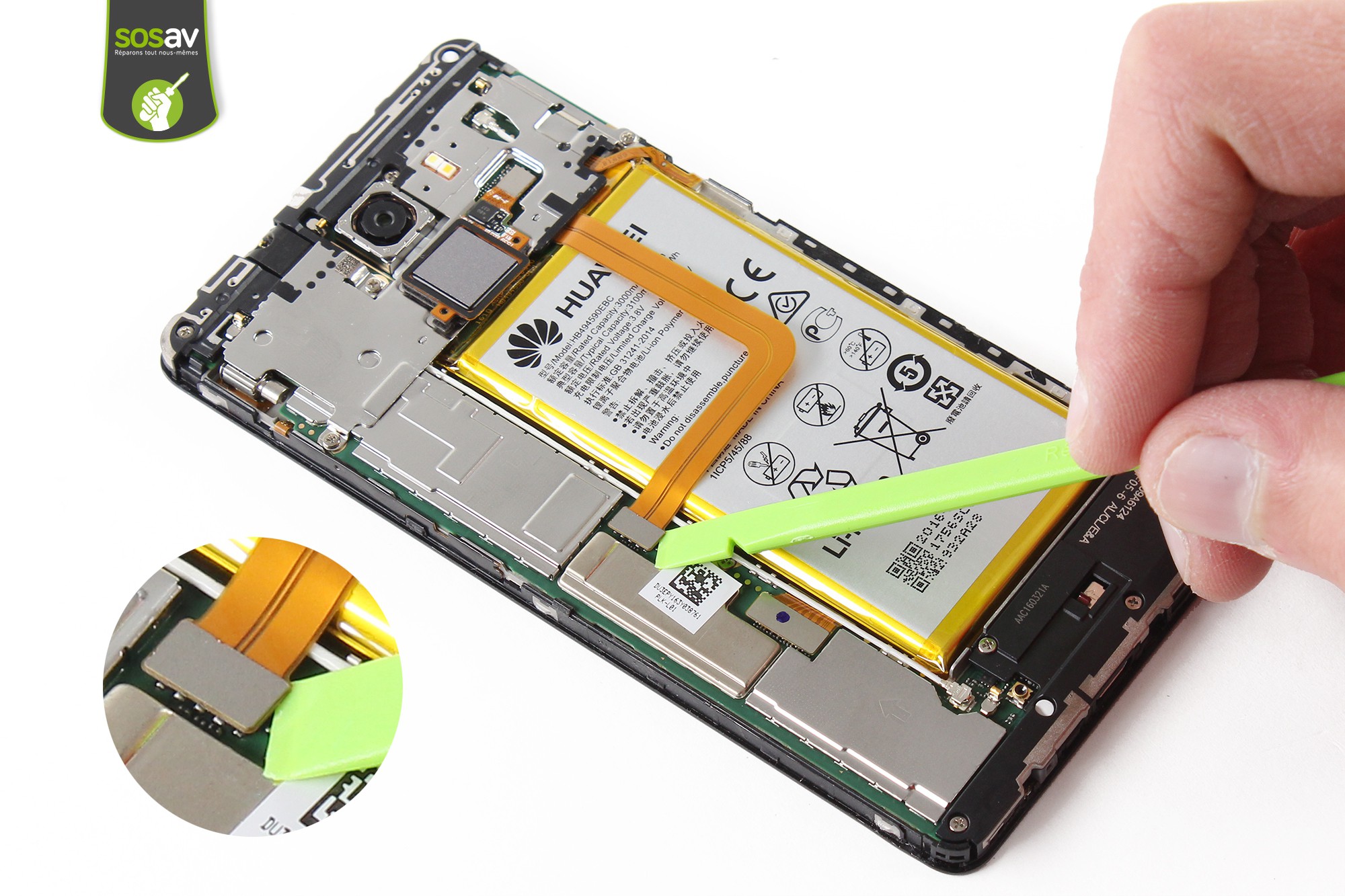 Avant de poursuivre le guide, il est nécessaire pour des raisons de sécurité de déconnecter la batterie du téléphone.Déconnectez la batterie grâce à la spatule en nylon.