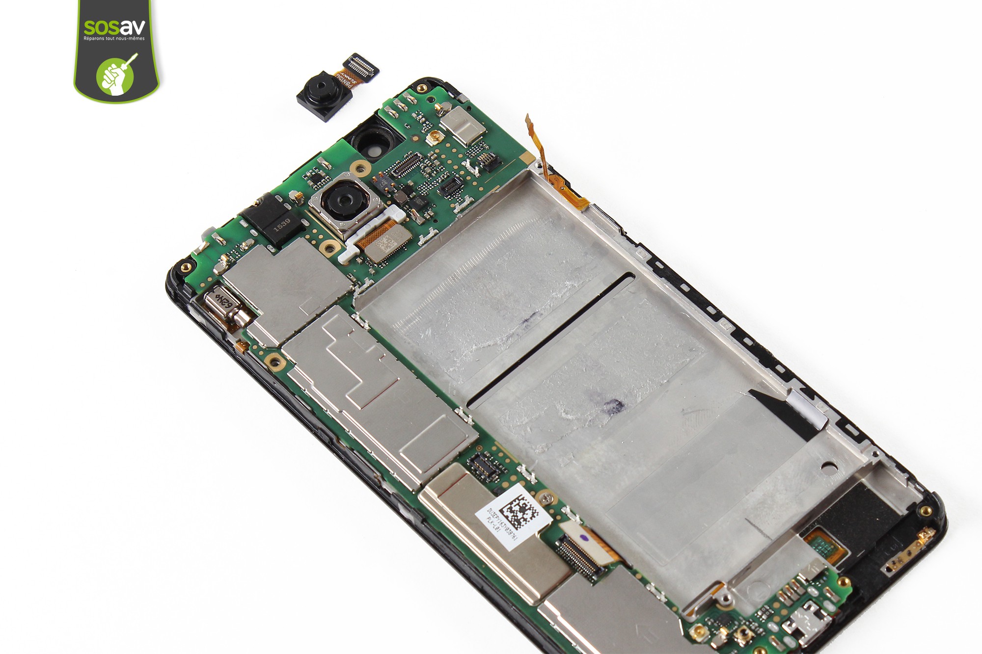 Déconnectez la caméra avant avec la spatule en nylon puis retirez-la grâce à la pince.