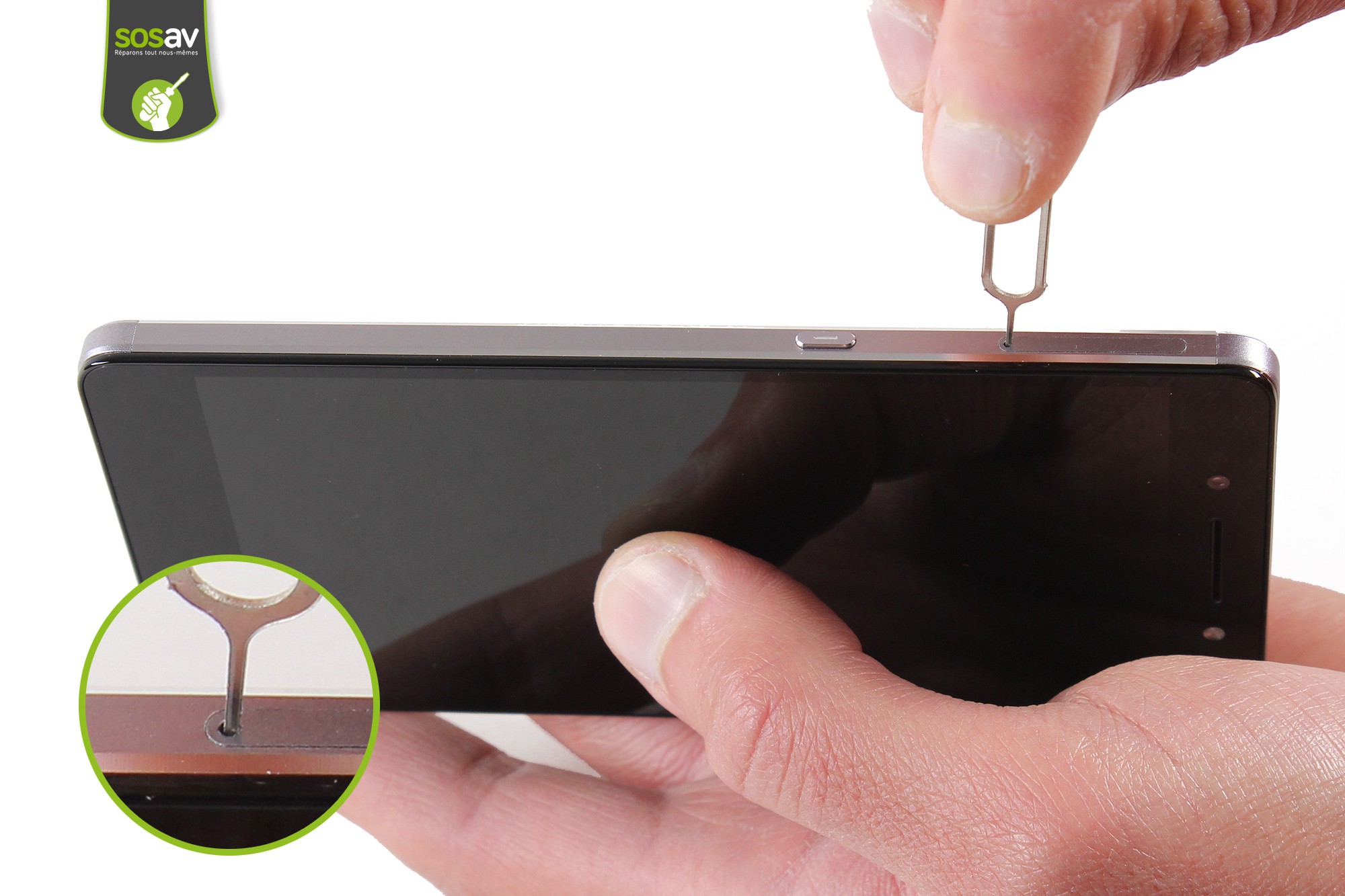 Prenez l'outil d'extraction du tiroir de la carte SIM/SD puis insérez-le dans le trou d'éjection.Saisissez le tiroir puis procédez à son retrait.Le tiroir SIM/SD de votre Honor 7 est maintenant retiré.