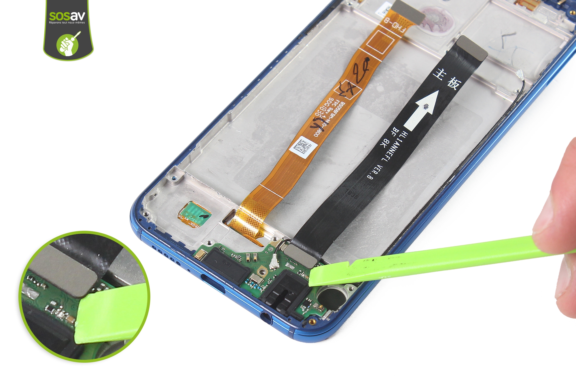 Toujours avec la spatule en nylon débranchez les nappes de liaison et munissez-vous de la pince métallique pour la déloger.
