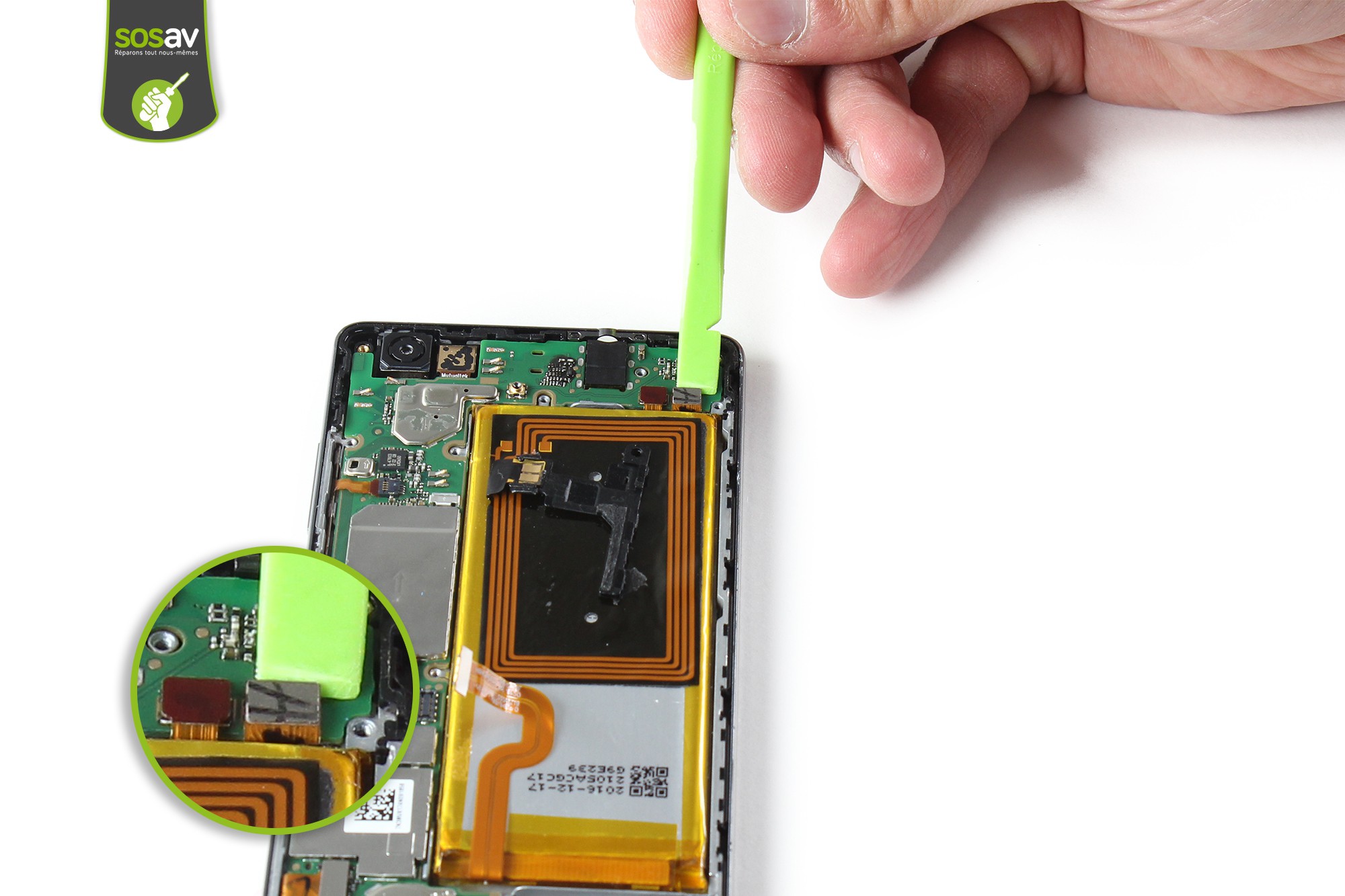 Déverrouillez ensuite le connecteur de la nappe des boutons power/volume avec la spatule en nylon puis sortez la nappe de son connecteur.