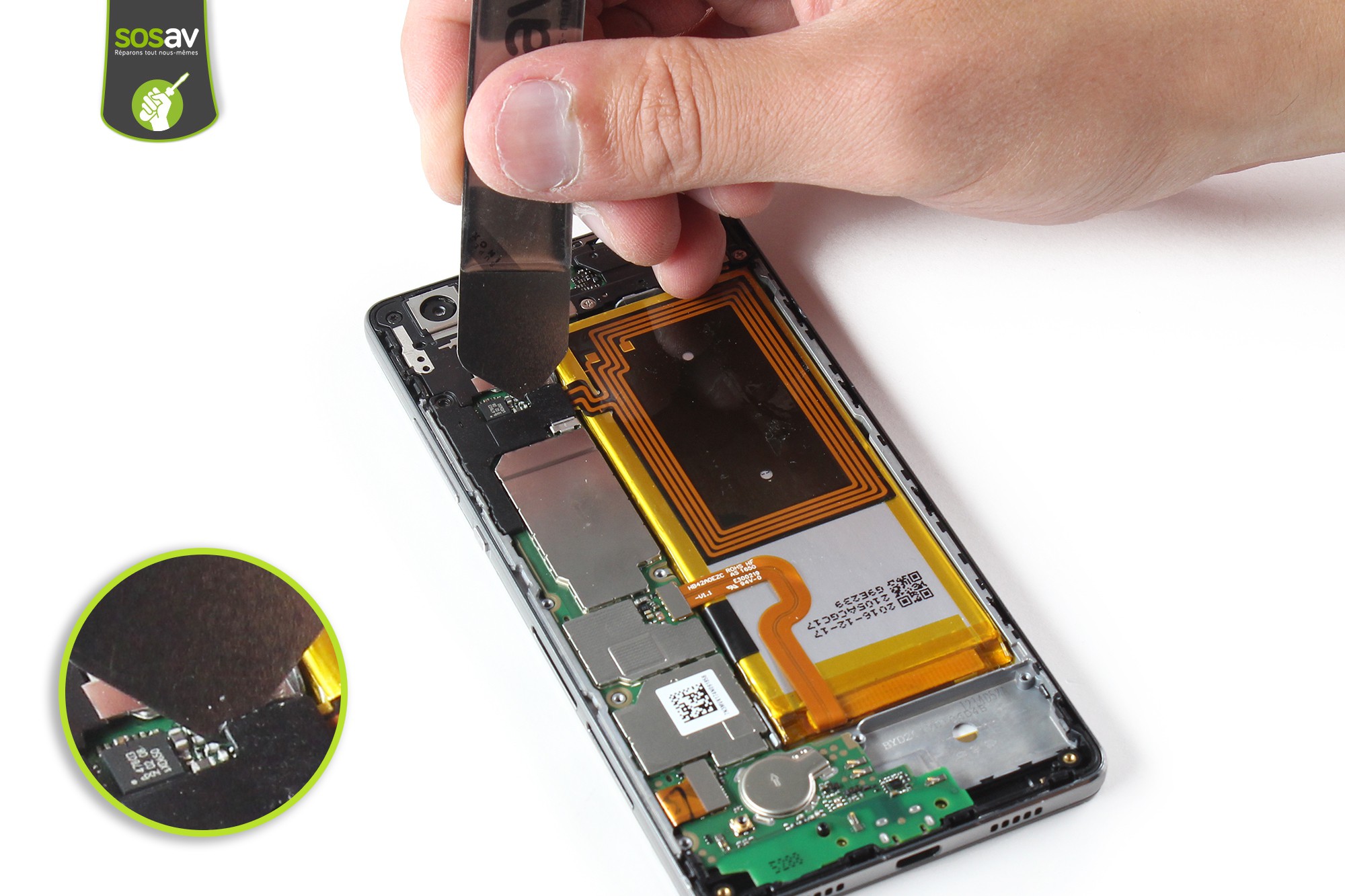 Déclipsez ensuite le cache connecteur de l'antenne NFC, côté carte mère, avec la spatule iSesamo.Soyez délicats lors de cette opération pour n'endommager aucun composant sur la carte mère !