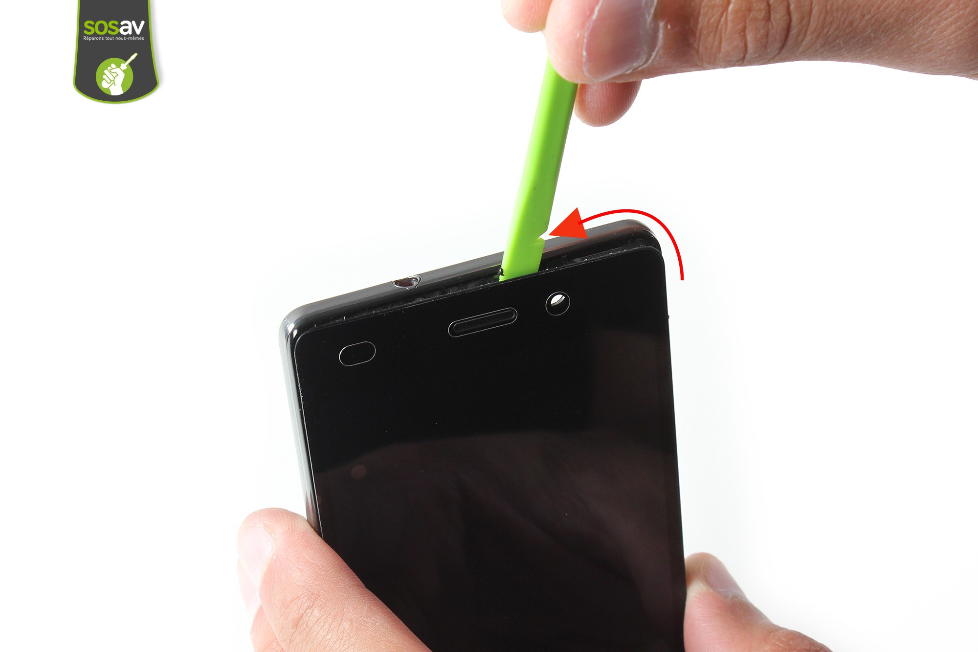 A l'aide de la spatule iSesamo, déclipsez le cache supérieur puis procédez à son retrait.