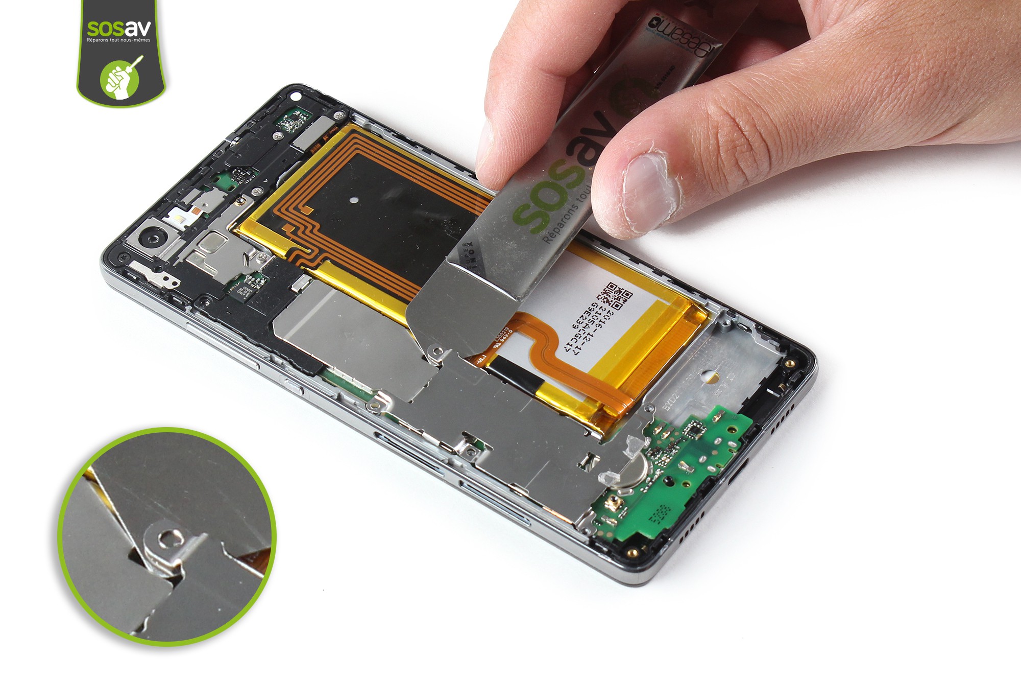 Pour plus de confort, nous vous suggérons de décaler le support de la nappe antenne NFC avec la spatule en nylon.