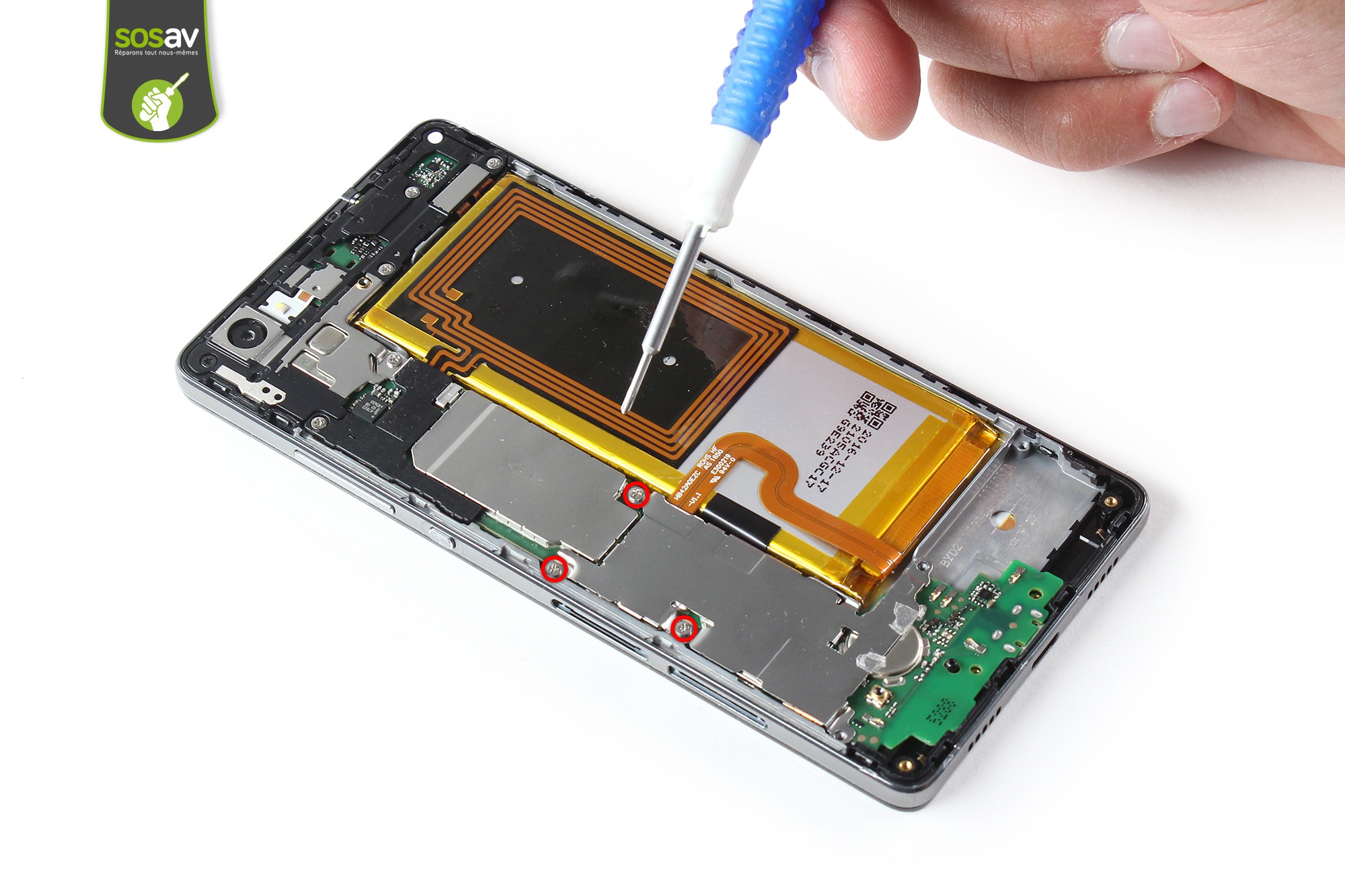 Dévissez les trois vis cruciformes entourées en rouge servant à maintenir le cache métallique du connecteur batterie.Dévissez également la vis entourée en rouge (photo numéro 2 de cette érape) servant à maintenir le cache de la nappe NFC.