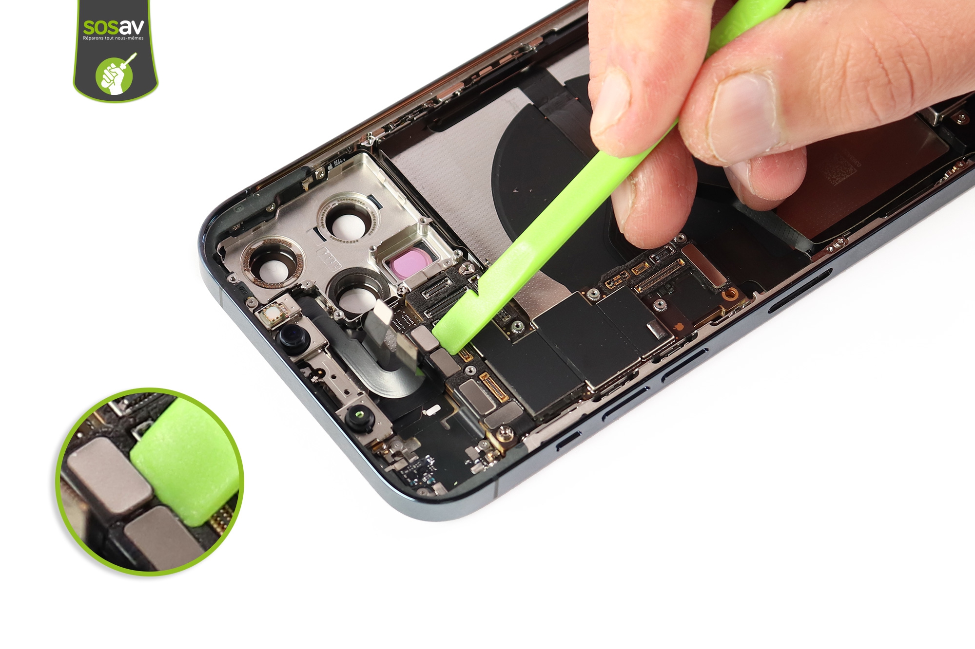 Avant tout chose, commencez par débrancher la batterie !Cela évite les risques éventuels de courts-circuits lors de votre réparation iPhone.