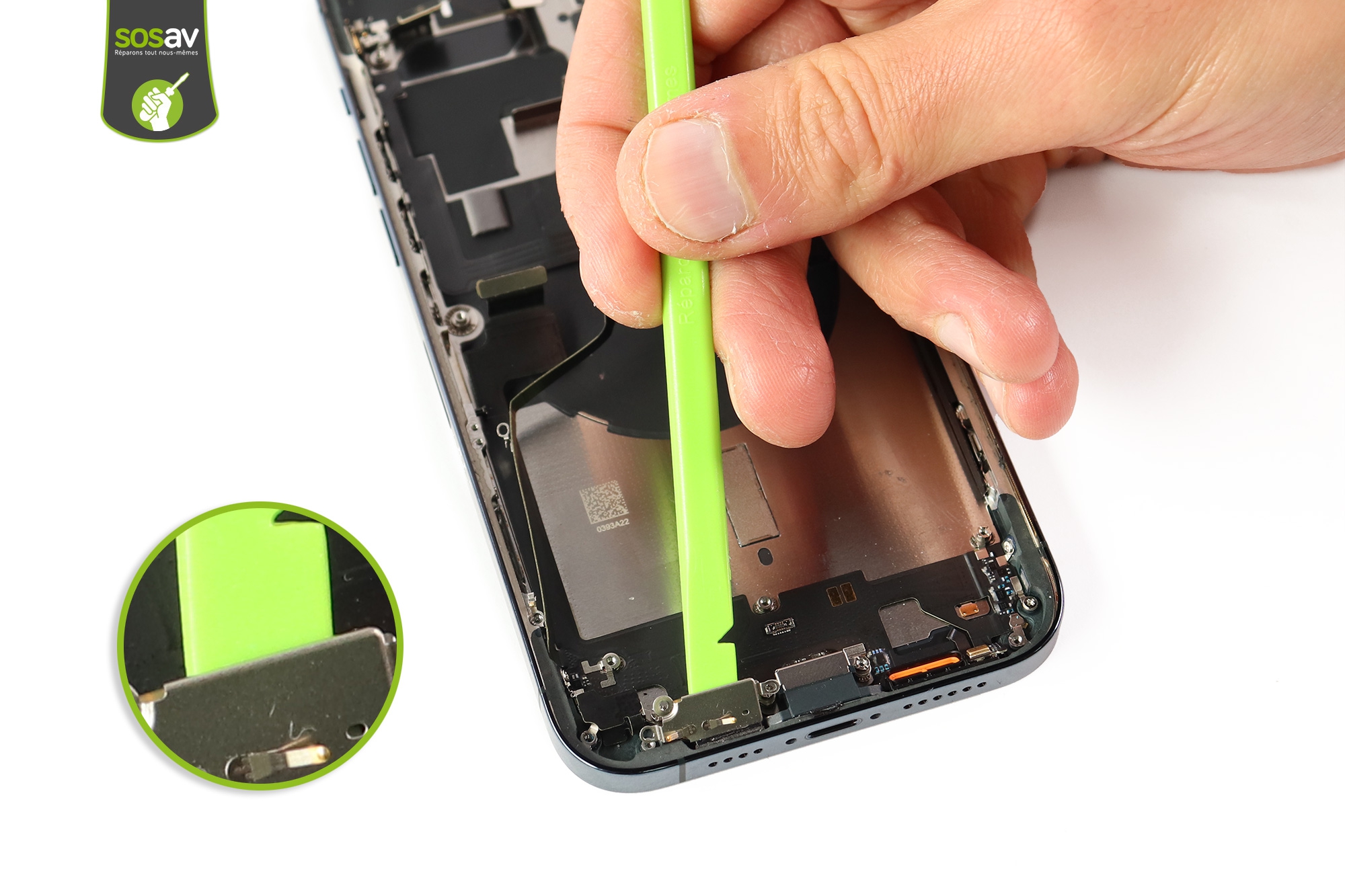 Réutilisez la spatule en nylon pour déverrouiller les nappes connecteur de charge et lecteur SIM.