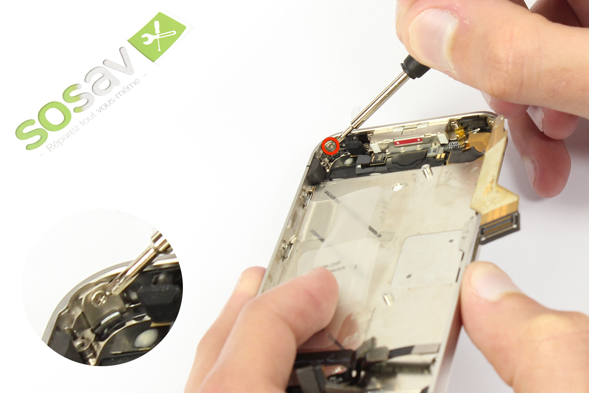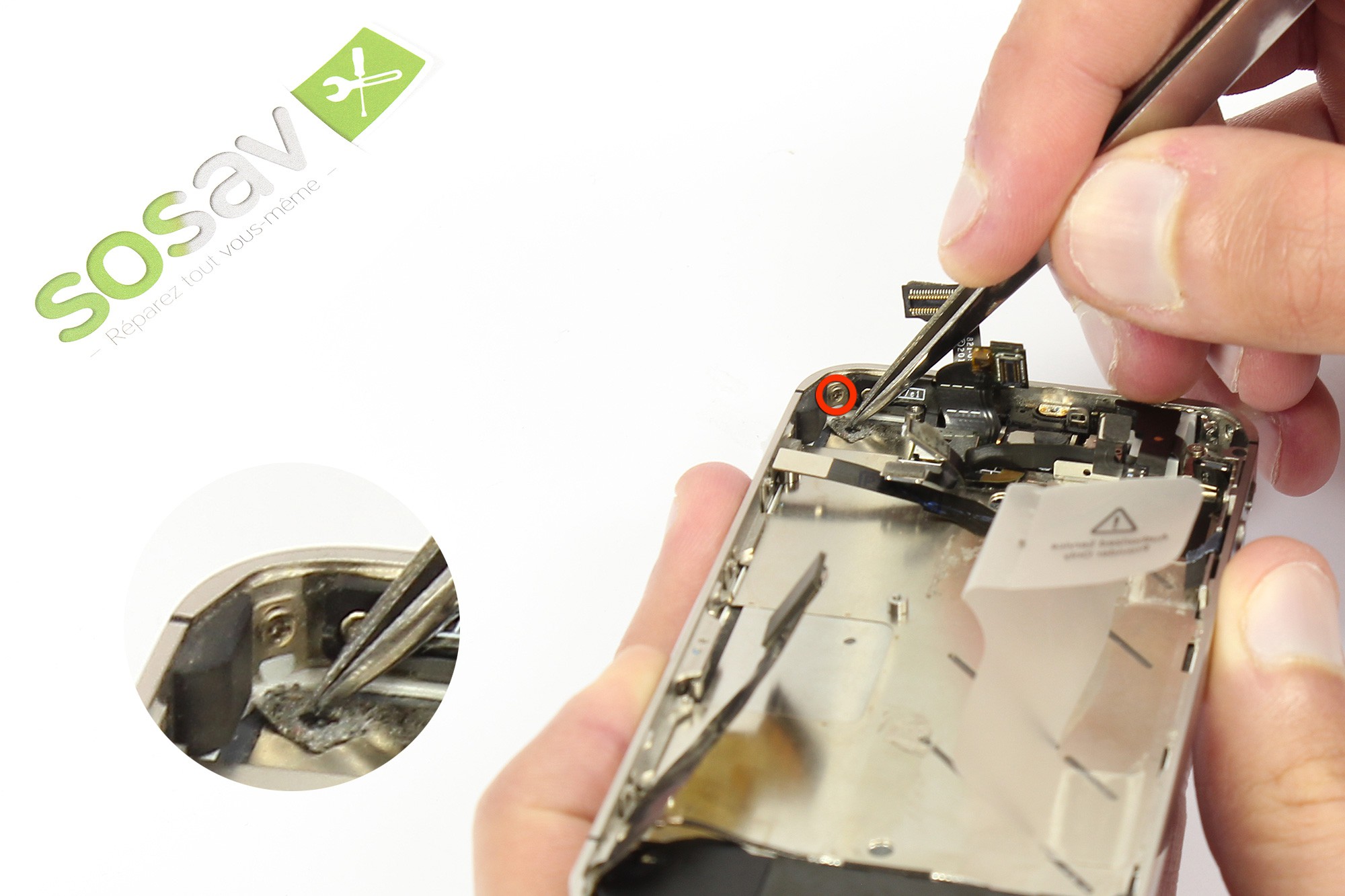A l'aide d'un tournevis cruciforme, dévissez la vis entourée en rouge.Cette vis permet de maintenir le clip de mise à la masse du téléphone.
