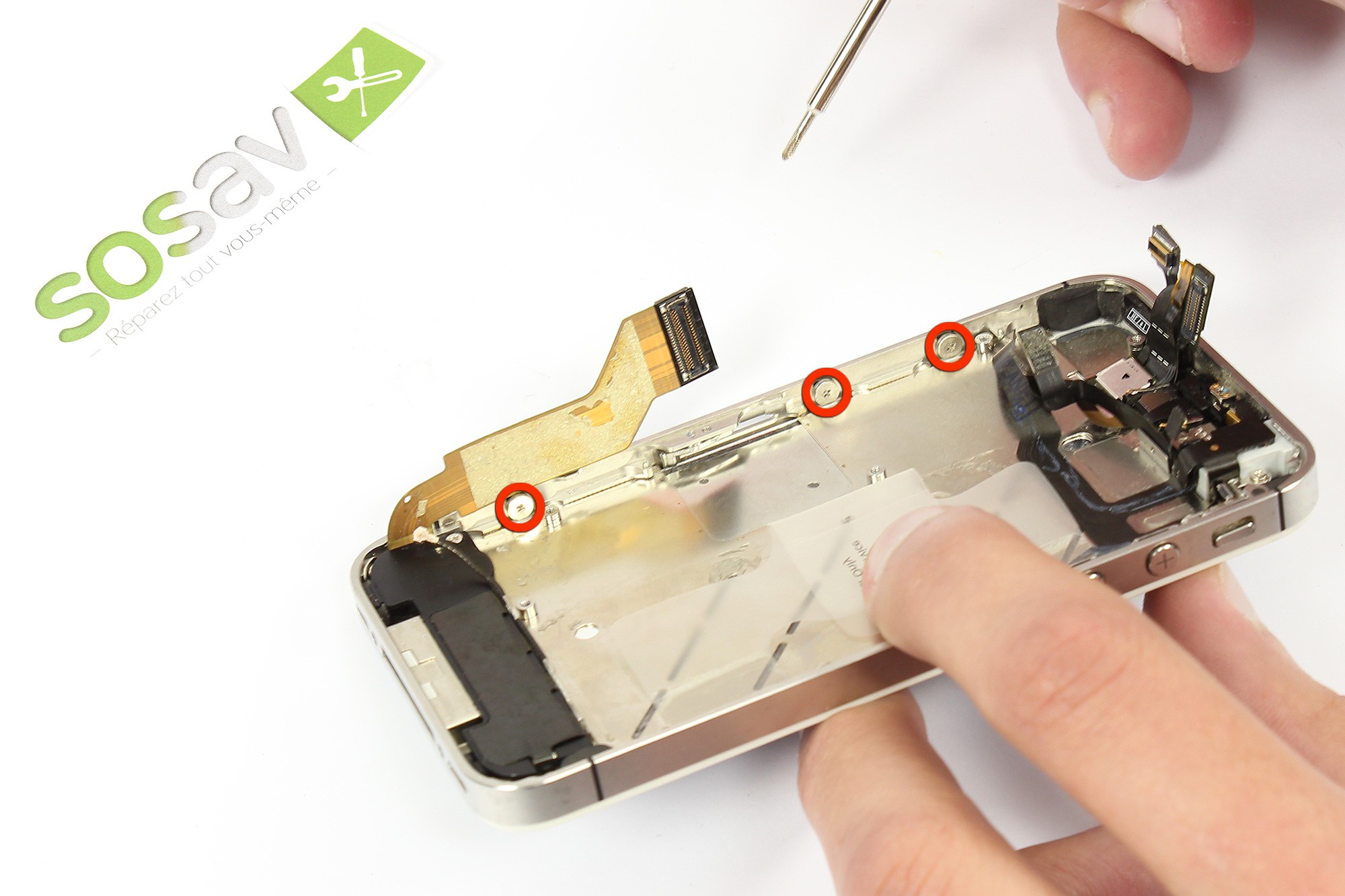 Toujours en vous servant du tournevis cruciforme, dévissez les trois vis entourées en rouge du côté droit du téléphone.Ces vis servent à maintenir l'écran sur le téléphone.Note : Attention à ne pas égarer les anneaux métalliques situés derrière chacune des vis !