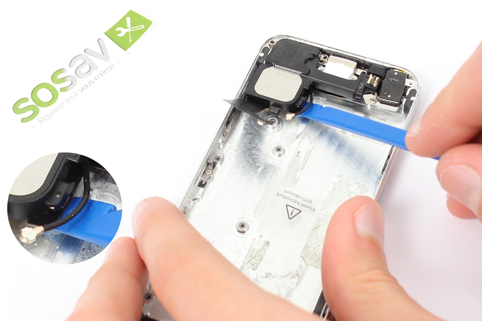 Utilisez la spatule en nylon afin de déclipser le connecteur de l'antenne GSM présent juste à côté du haut-parleur bas (appelé aussi haut-parleur externe) du téléphone.