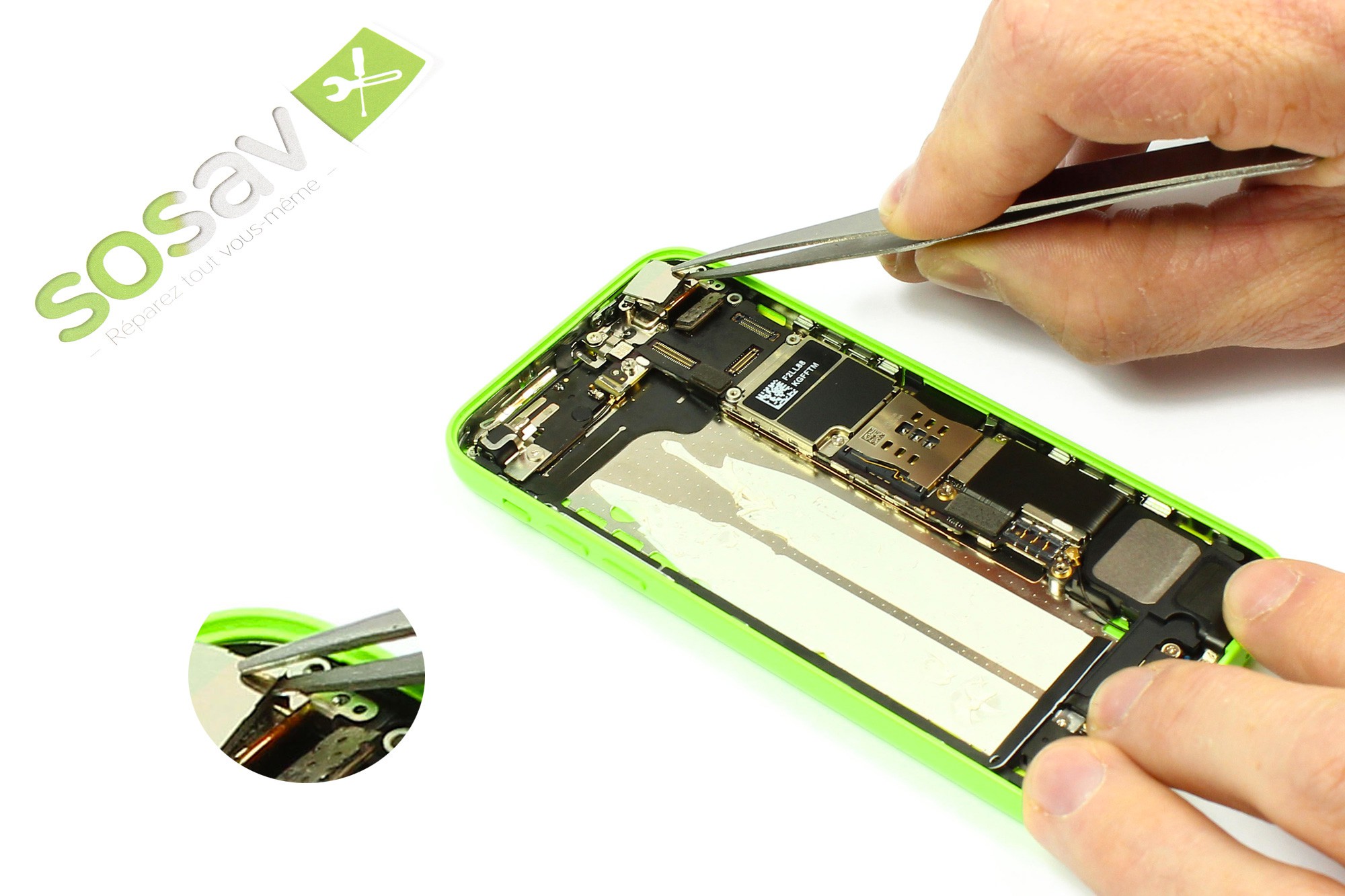 A l'aide d'une pince, enlevez désormais le cache connecteurs de votre iPhone 5c.