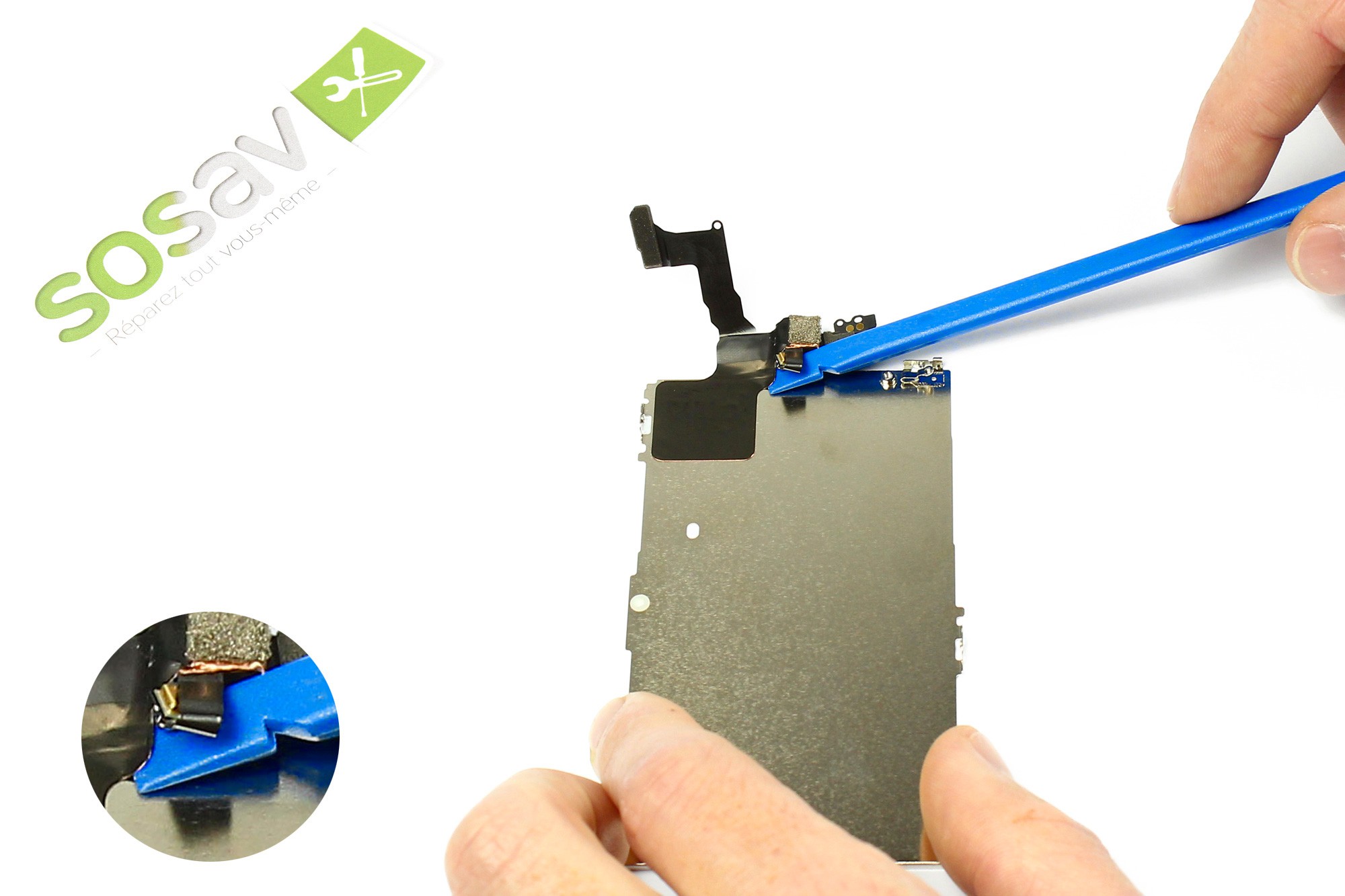 Toujours avec le côté plat de la spatule, venir soulever le haut parleur interne afin de l'extraire de son emplacement.