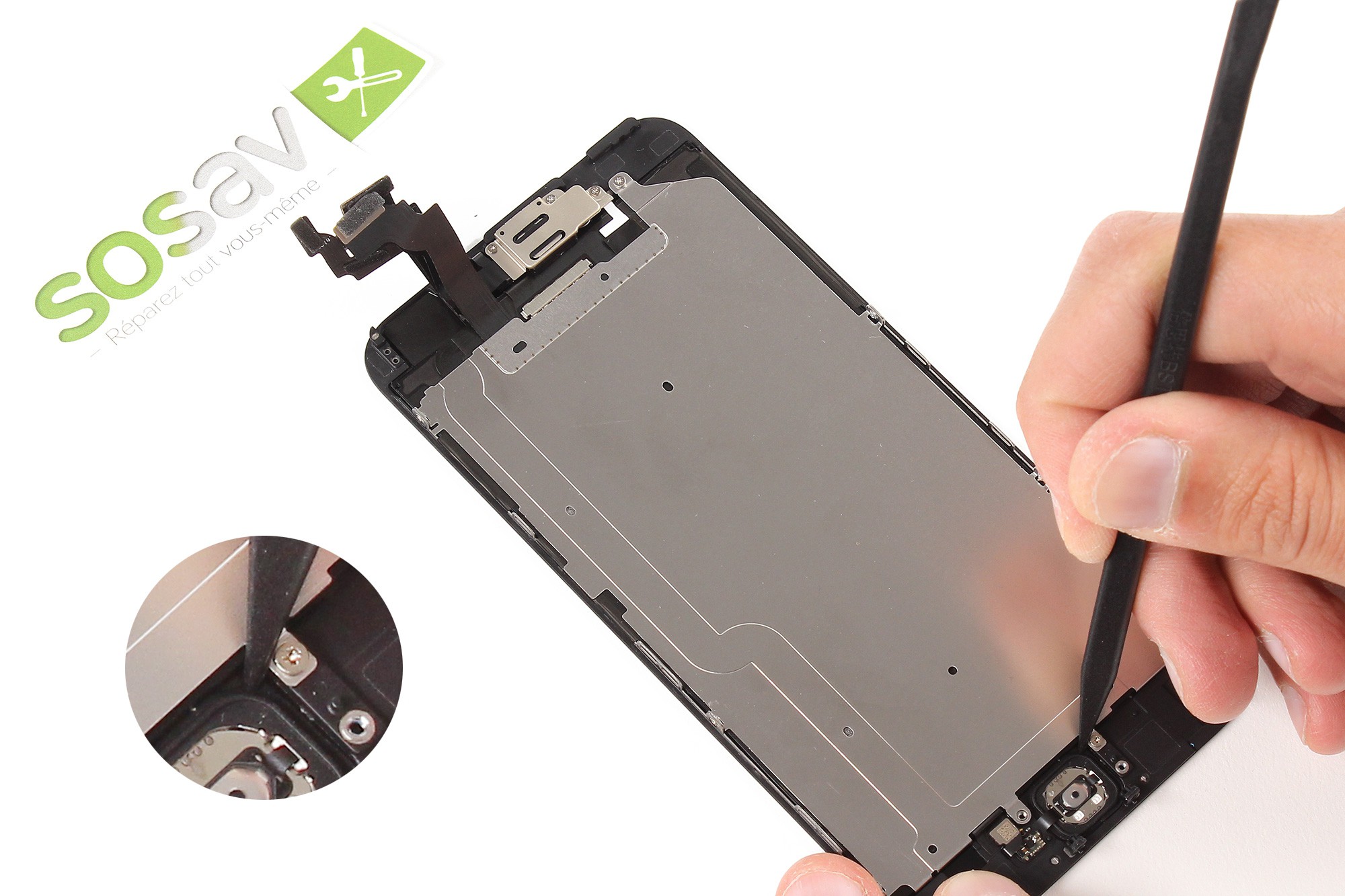 Attention, la nappe du bouton home est très fine, effectuez donc cette opération avec la plus grande précaution. En cas de besoin.