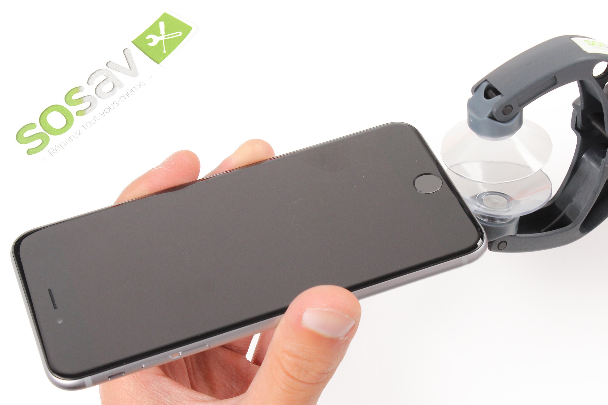 Les ventouses de la pince doivent être positionnées au plus proche du bouton home de l'iPhone (bouton situé en bas) comme indiqué sur les photos afin de garantir la meilleure adhérence possible.