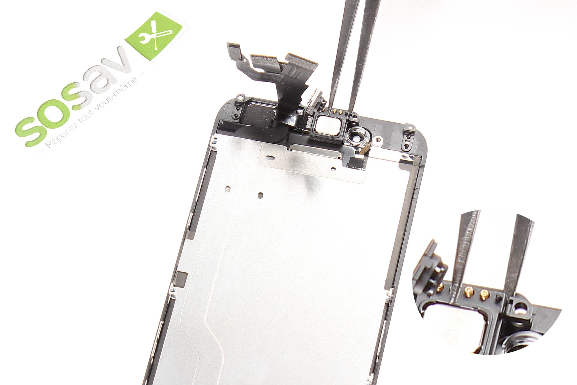 A l'aide de la pince, saisissez puis retirez l'élement métallique d'appui du haut-parleur interne (haut-parleur d'écoute).