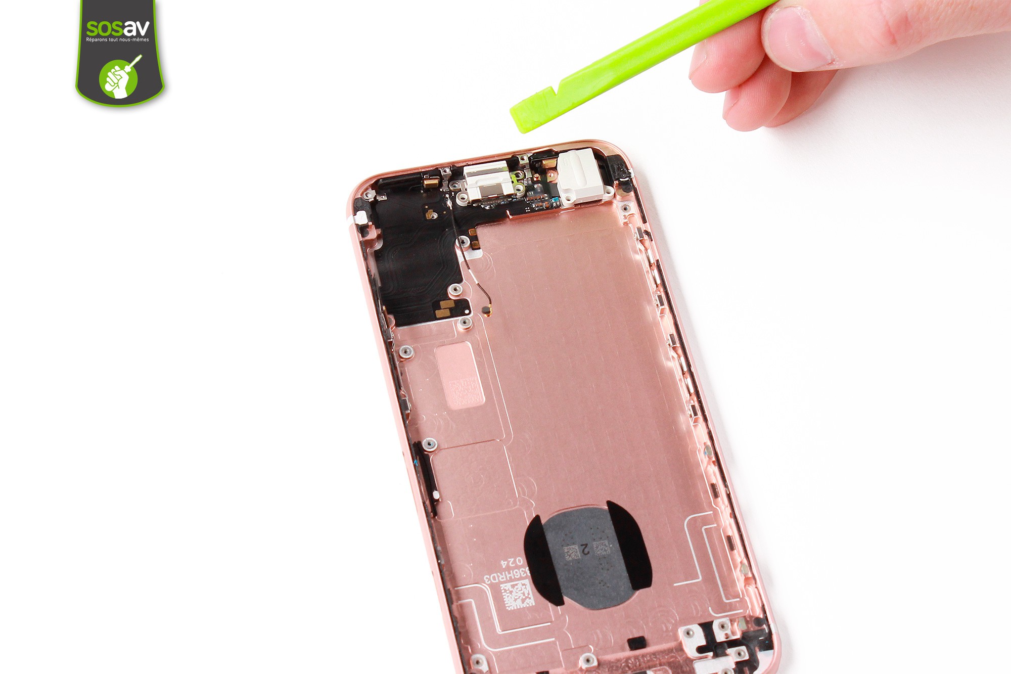 Insérez délicatement la spatule sous le haut-parleur externe afin de le soulever. Aucune résistance ne doit se faire sentir.Attention toutefois à la nappe du connecteur de charge qui se situe sous le haut-parleur.