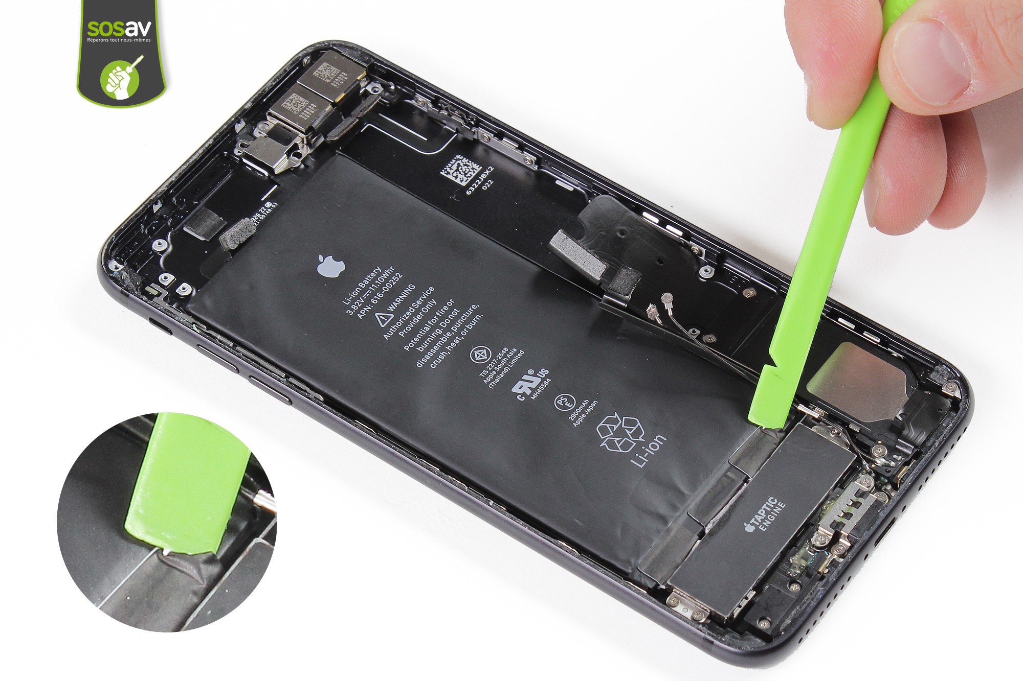 Une fois les 3 adhésifs retirés, soulevez la batterie avec la spatule en nylon.Procédez ensuite à son retrait.La batterie de votre iPhone 7 Plus est retirée.