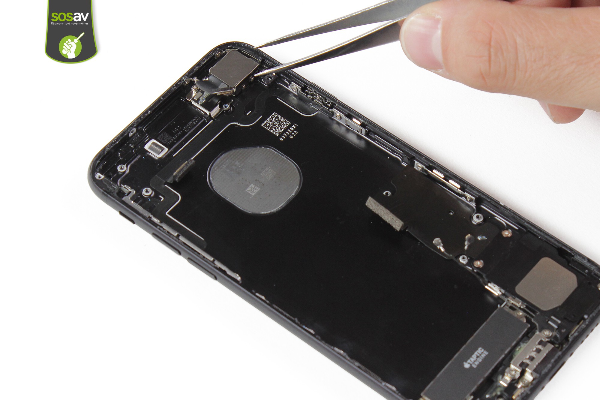 Puis avec la pince en métal, retirez le cache de protection du connecteur du vibreur.