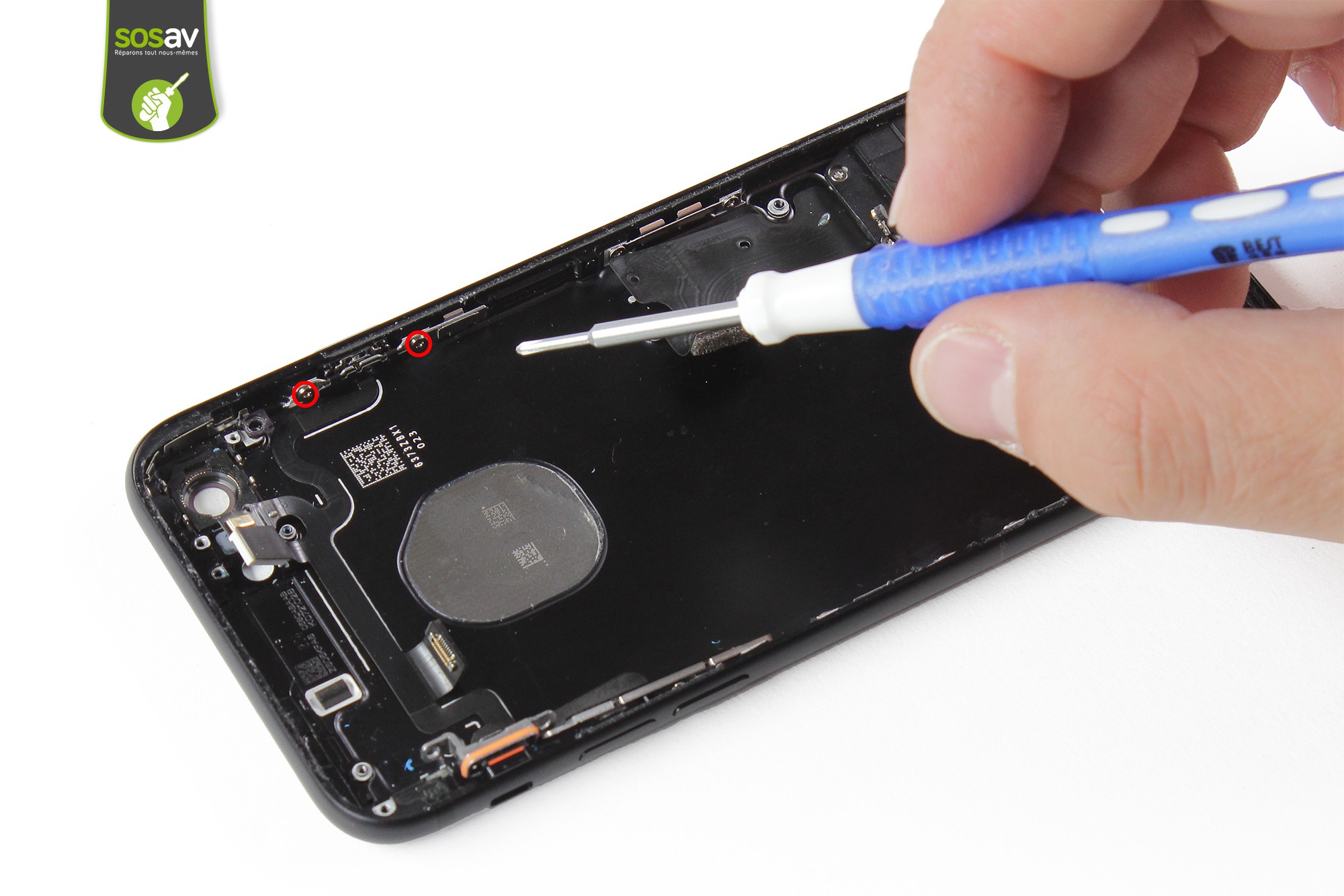 Utilisez le tournevis cruciforme pour dévisser les 2 vis entourées en rouge.Ces vis servent à maintenir le cache métalique de la caméra arrière.