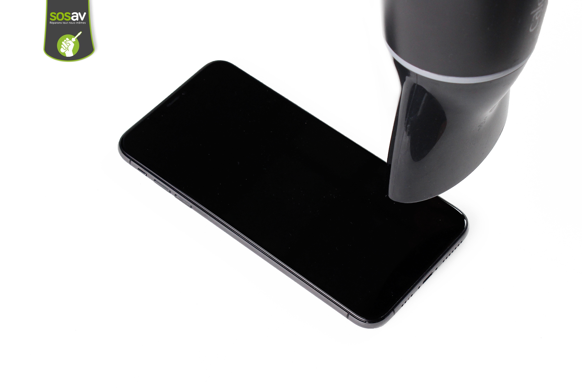 L'écran sur l'iPhone XS Max est collé sur le châssis par un joint faisant le tour du téléphone.Pour en venir à bout, rien de plus simple , on chauffe l'ensemble à l'aide d'un sèche-cheveux histoire de ramollir le joint. Notre spatule iSesamo accompagnée de son frère le médiator viennent se joindre à la petite fête pour décoller l'ensemble.Attention à ne pas insérer le médiator trop loin au risque d'endommager les nappes.