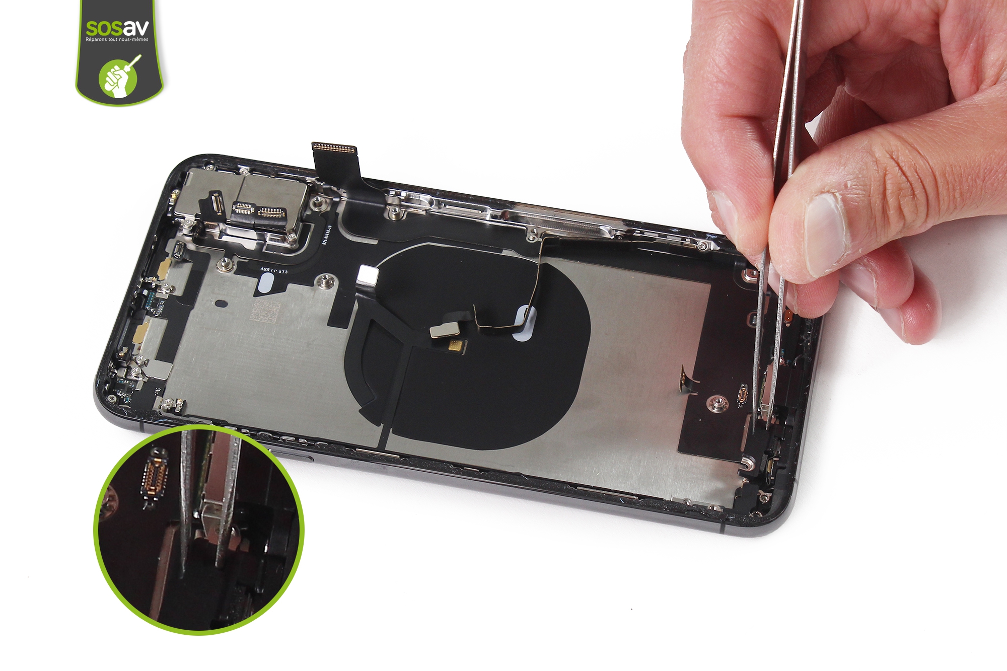 Allez, on déconnecte l'écran !Mise à part la taille XL de cet écran iPhone XS Max, il est le jumeau quasi parfait de l'iPhone X. La seule différence étant les petites fixations. (Ce qui empêche de pouvoir interchanger les écrans iPhone X et Xs d'ailleurs)