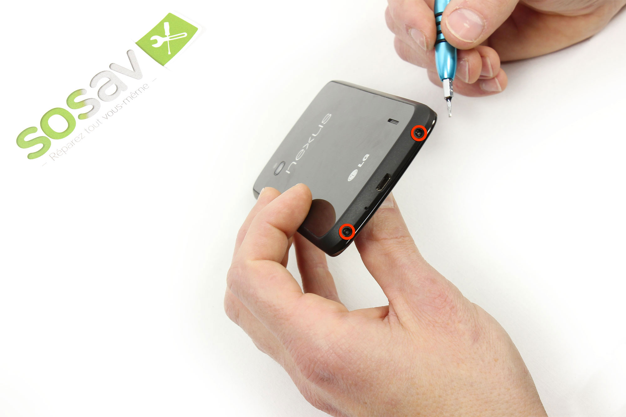 Avec le tournevis Torx (T5) fourni dans nos kit outils, dévissez les 2 vis 4 mm retenant la coque arrière au châssis interne de votre Nexus 4.