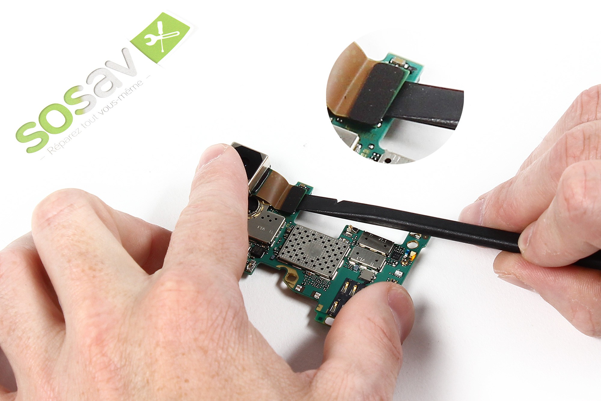 A nouveau à l'aide d'une spatule en nylon, faites délicatement levier afin de déconnecter la nappe de gestion des boutons (volumes, power, appareil photo).