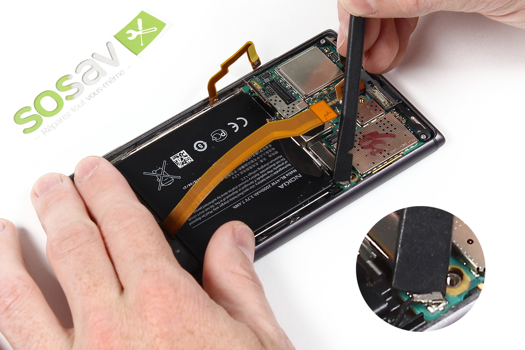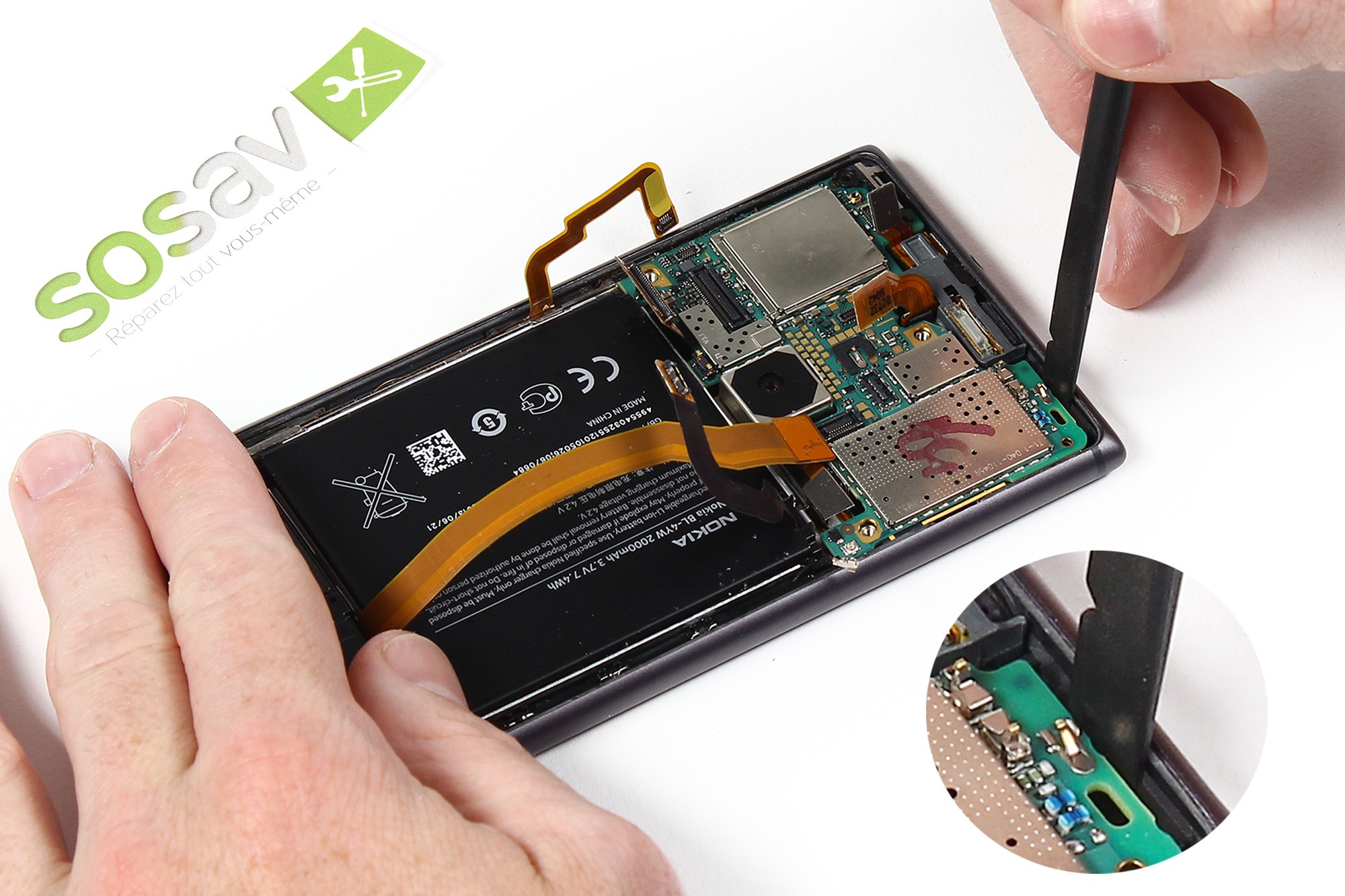 A nouveau à l'aide d'une spatule en nylon, faites délicatement levier afin de déconnecter la nappe de gestion des boutons (volumes, power, appareil photo).