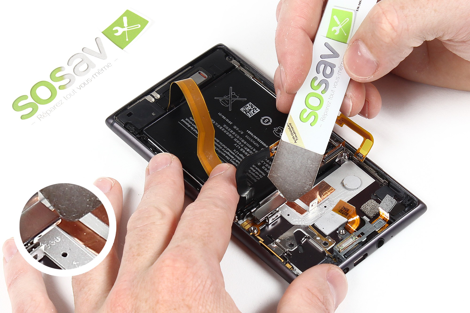 A nouveau à l'aide d'une spatule en nylon, faites délicatement levier afin de déconnecter la nappe de gestion des boutons (volumes, power, appareil photo).