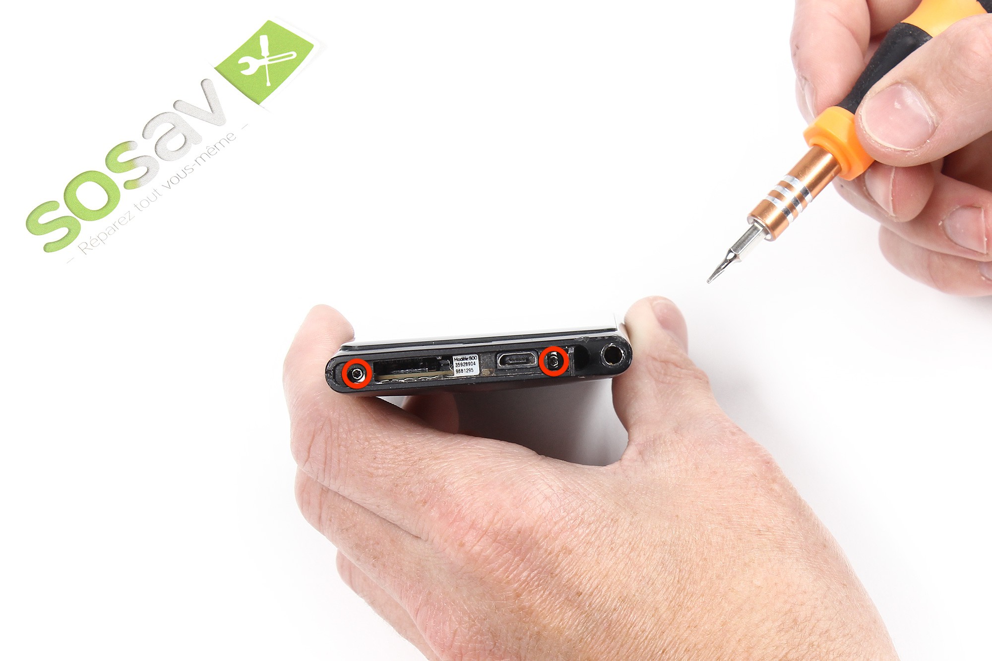 Dévissez les 2 vis torx T5 entourées en rouge sur la photo. Celles-ci retiennent l'écran au châssis de votre Nokia Lumia 800.