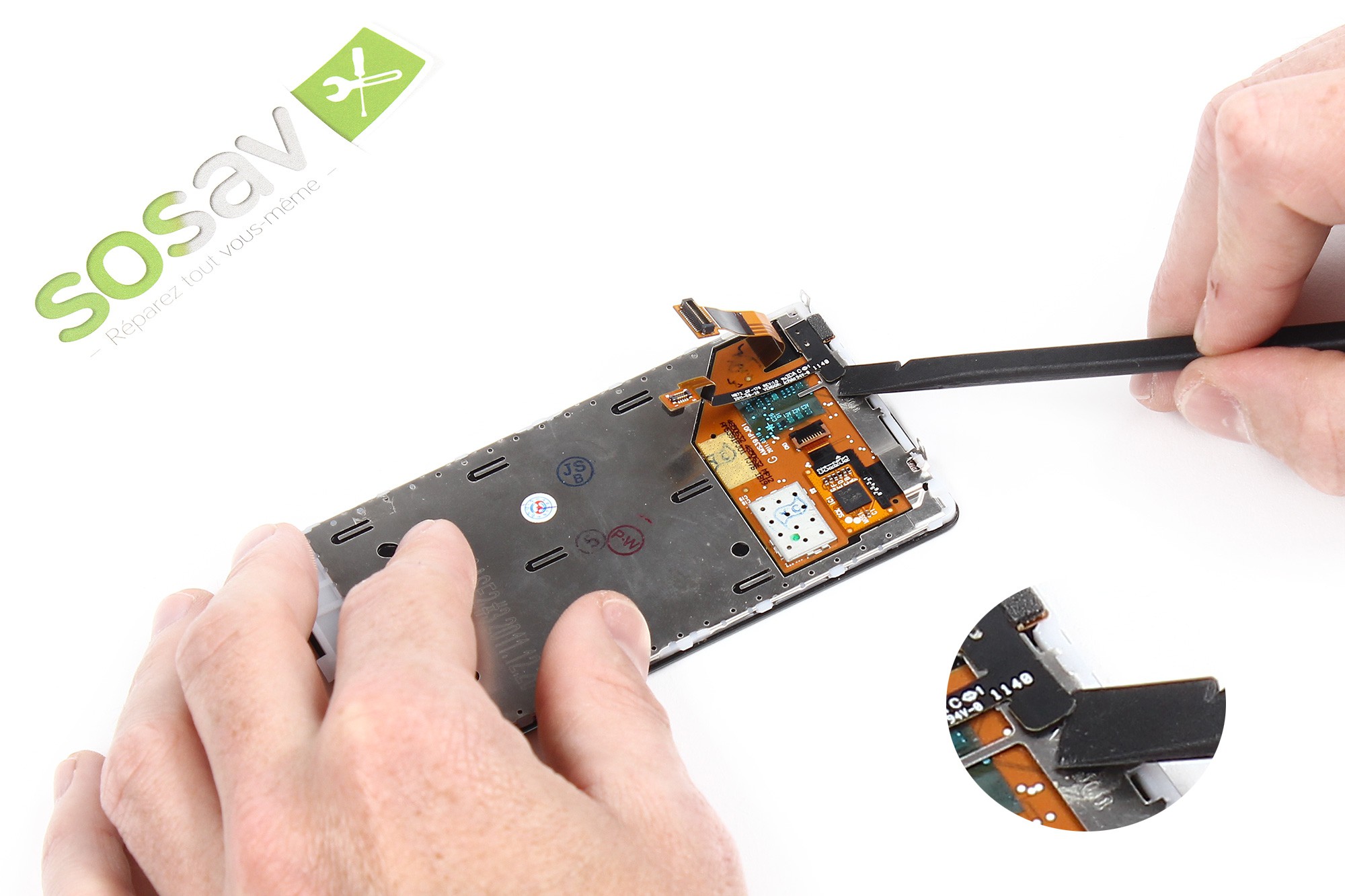Avec le côté plat de la spatule, décollez la nappe du capteur de proximité.