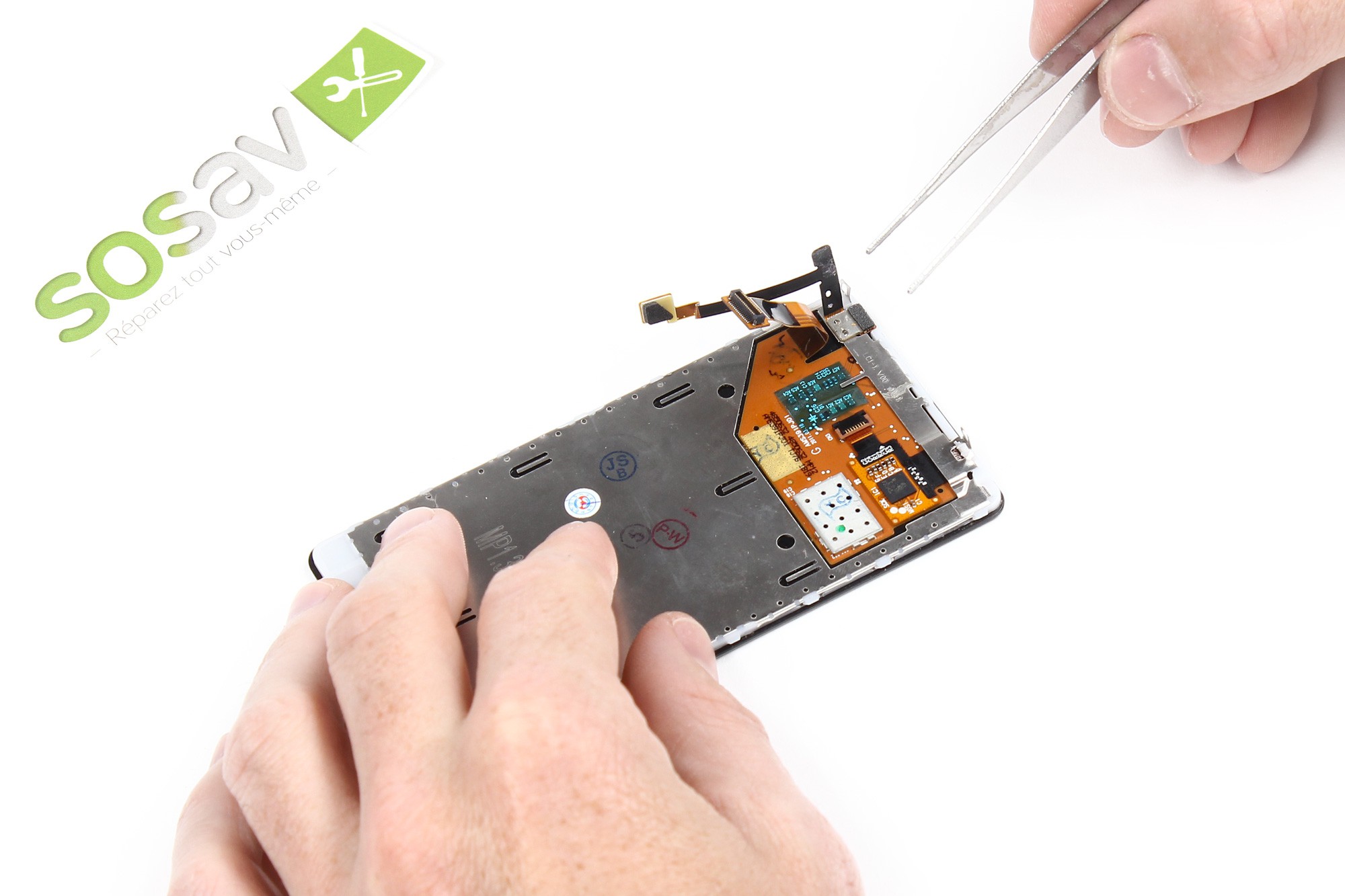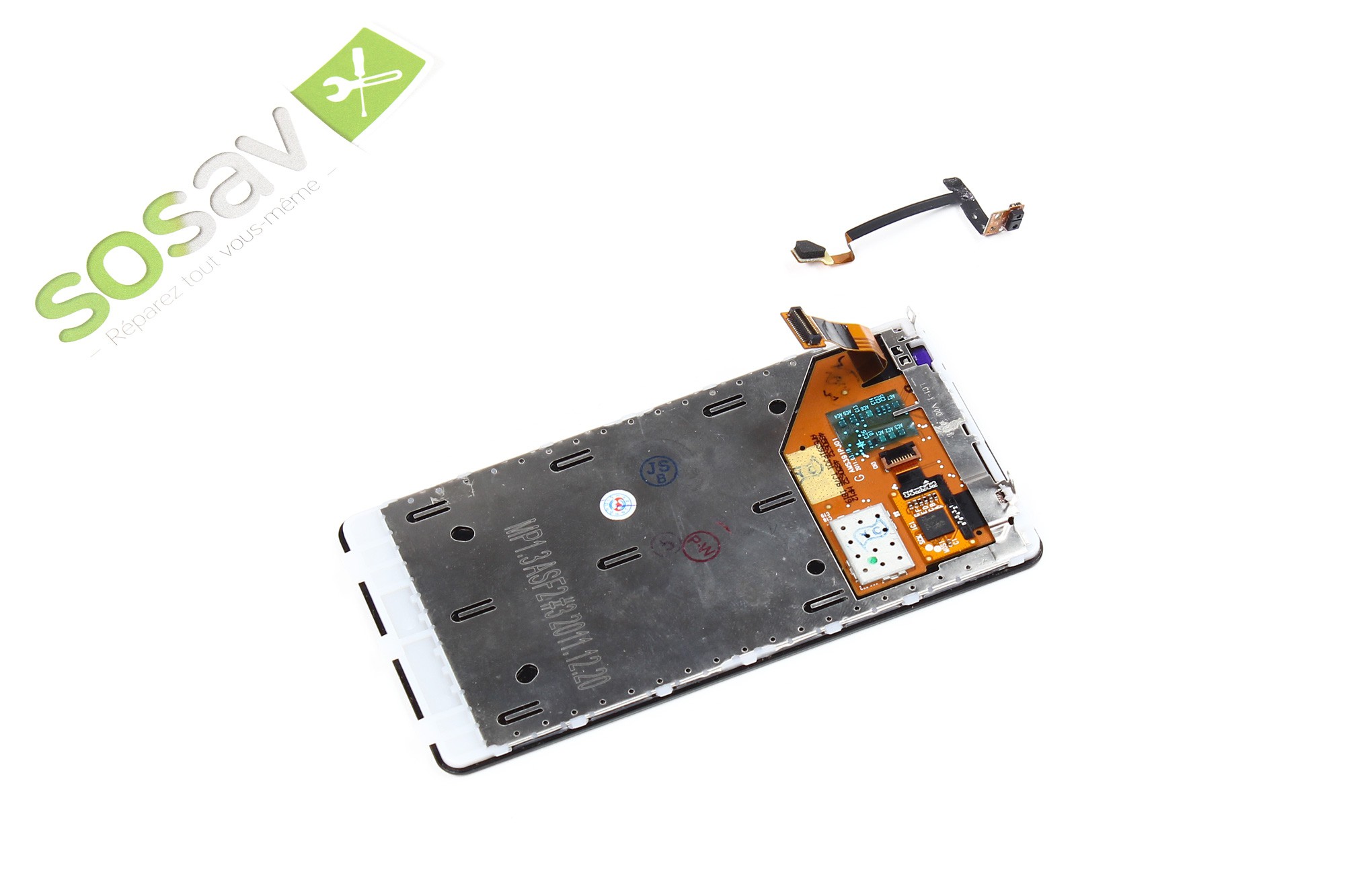 celui-ci est encore retenu par sa nappe de connexion ainsi que la nappe du capteur de proximité.