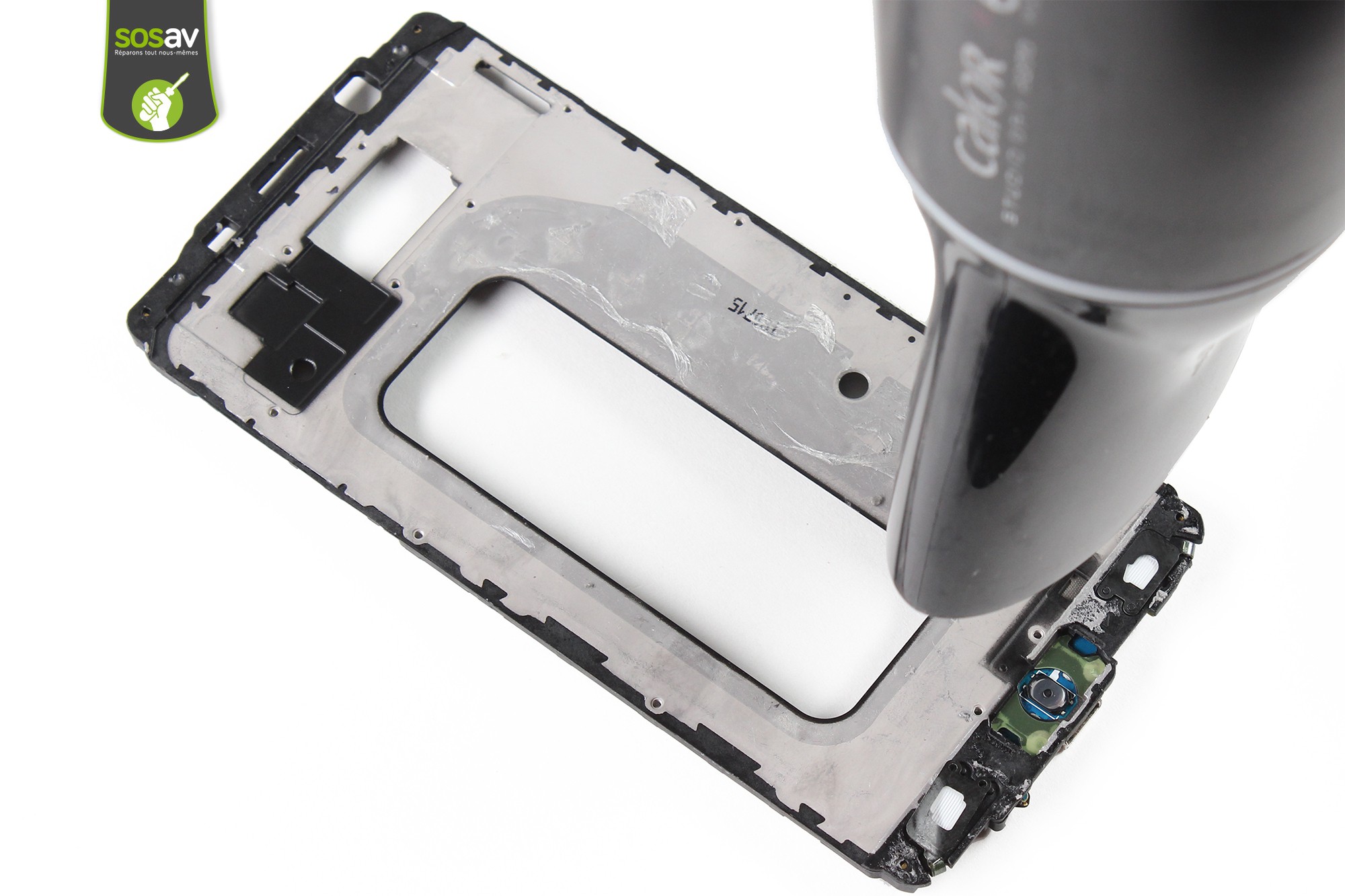 Afin de décoller l'écran, il est nécessaire de le réchauffer durant 3 à 5 minutes à l'aide du sèche-cheveux.L'écran du Galaxy A5 2016 est très solidement collé au châssis. Nous vous suggérons de réchauffer régulièrement l'écran au fur et à mesure des étapes pour plus de simplicité. Soyez très délicats lors du décollement de l'écran, ce dernier étant très fin et par conséquent, relativement fragile et sensible, le risque de casse est très élevé.