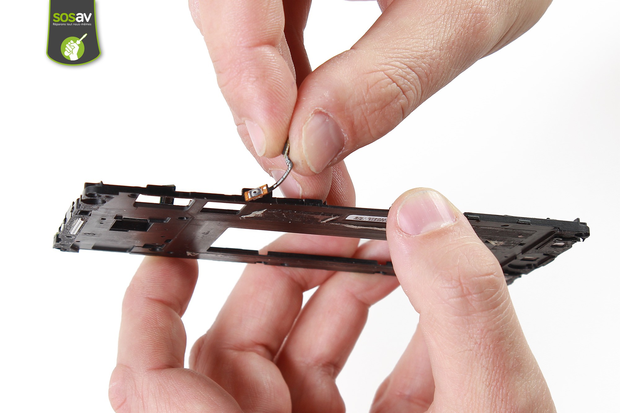 Avec la pointe de la spatule, décollez la nappe du bouton tactile droit du châssis.