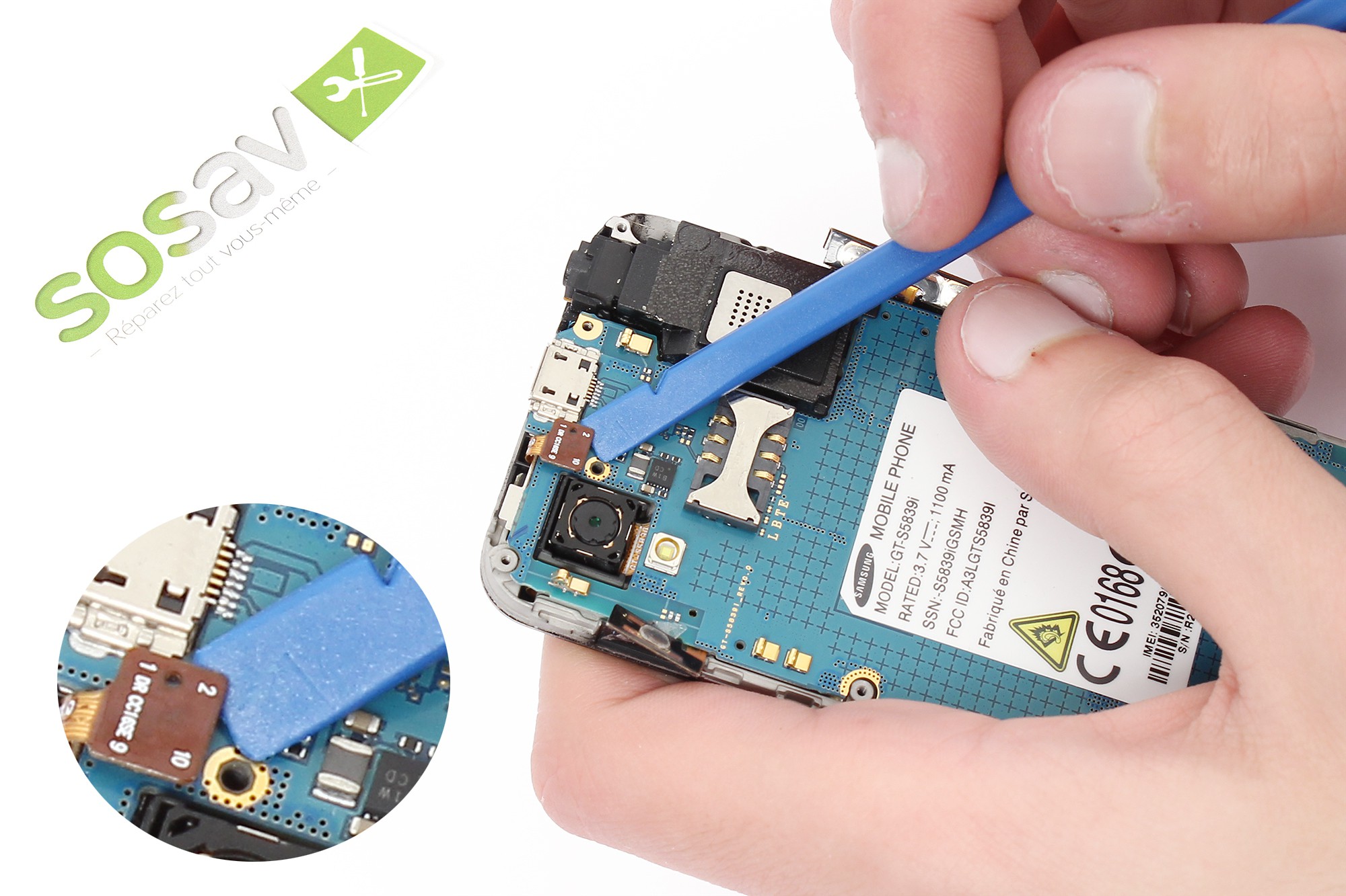 A l'aide d'une spatule en nylon, déclipsez le cache port USB localisé en haut du téléphone.