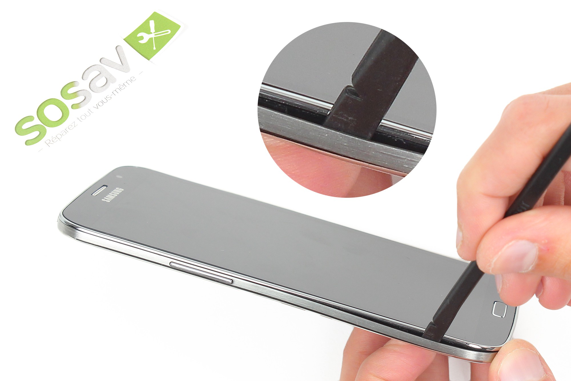 Insérez la spatule en nylon dans l’interstice entre l’écran et le châssis interne du Galaxy Mega afin de la déclipser et retirer.