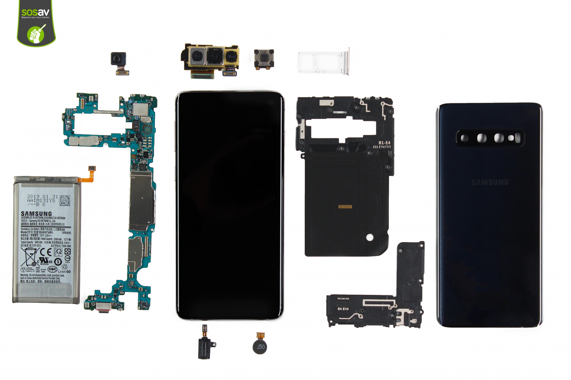 Le grand jour est arrivé ! Le Galaxy S10 fait une entrée fracassante dans les locaux de SOSav ! Et nous n?avons pas tardé à le faire parler ! A peine arrivé, il est déjà dans les mains experts de nos experts pour lui faire avouer ses secrets les plus cachés? Et nous allons partager avec vous toutes nos trouvailles ! Comment se répare le Galaxy S10 ? Est-ce que c?est à nouveau un bis repetita du Galaxy S9 ou du Note 9 ? On vous dit tout, absolument tout dans ce démontage complet ! Vous pourrez assouvir votre curiosité et découvrir avec nous les entrailles de la bête ! Et cet écran borderless, qu?en est-il ? Quid de ce triple capteurs photo ? Bref, fini de bavarder, voici notre démontage complet pour pouvoir anticiper votre réparation Galaxy S10 dans les prochains mois :)