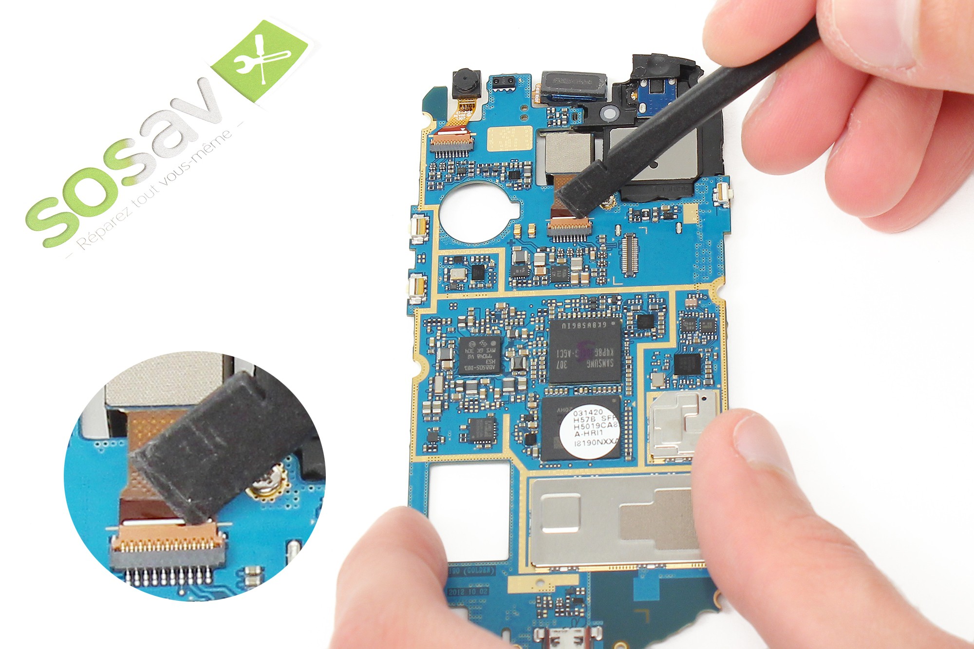 Muni de la spatule en nylon, déconnectez les deux nappes localisées en bas de la carte mère.