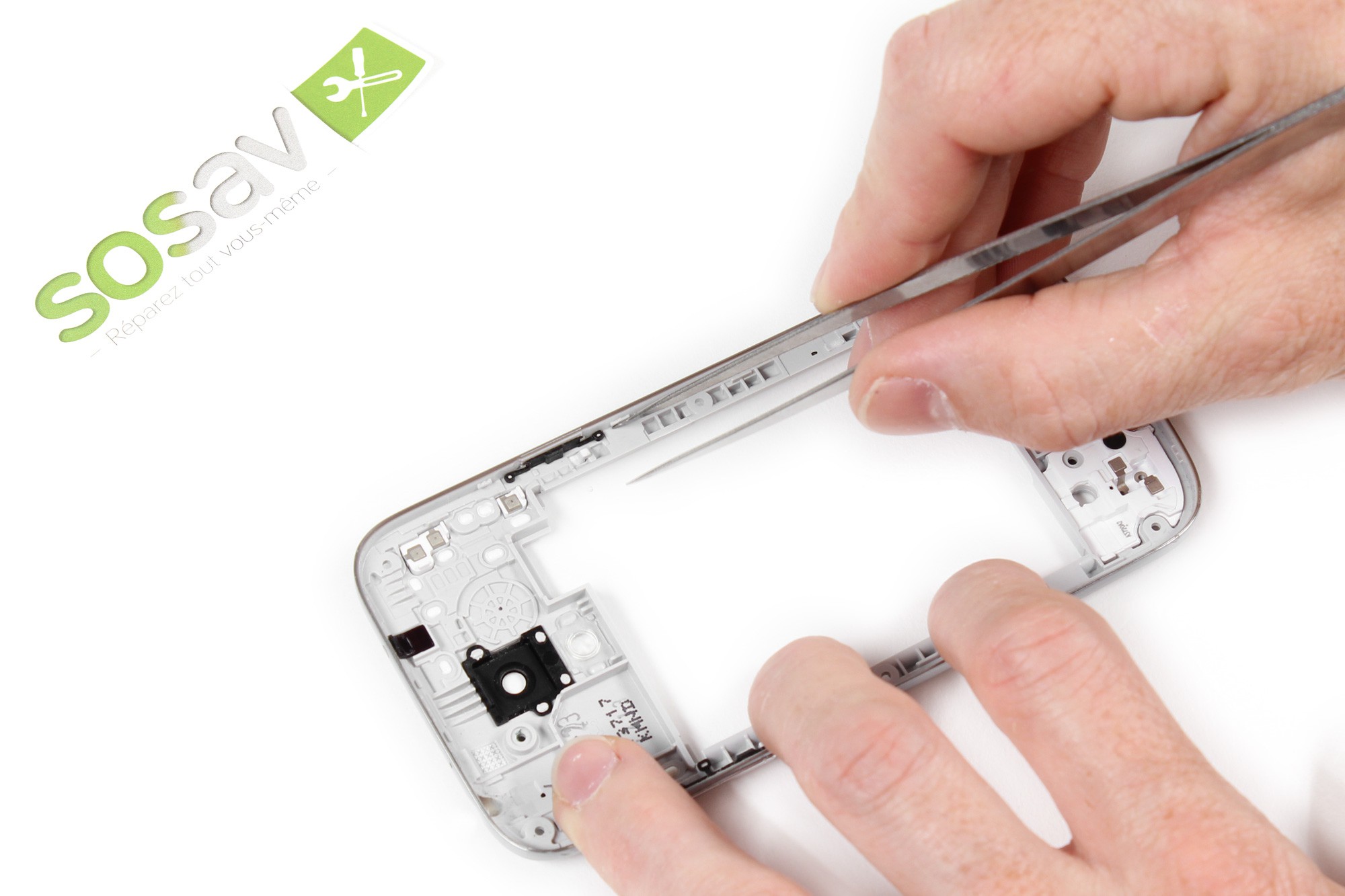 Avec la pince, saisissez le bouton power pour le retirer délicatement.